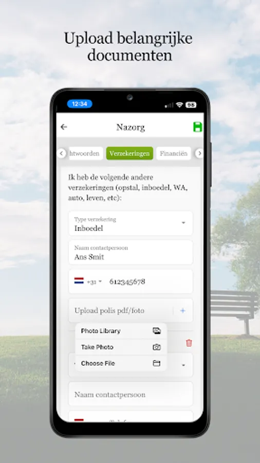 * Verzekeringen: verzekeraar, adviseur, contactpersoon, telefoon en website + inloggegevens, uploaden polis