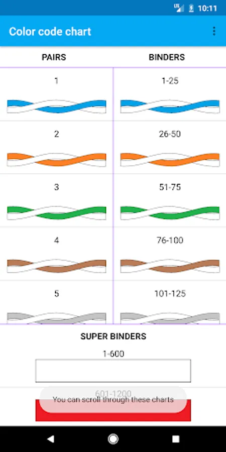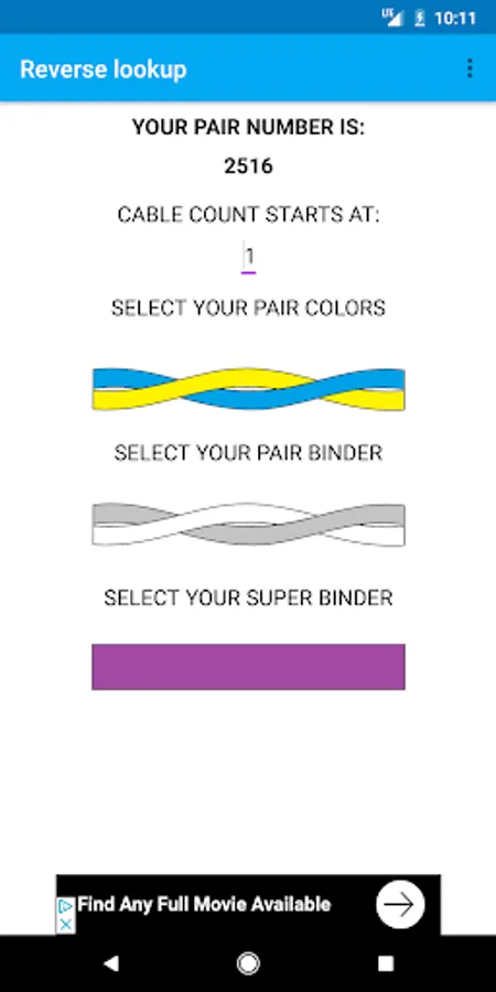 Copper & Fiber Calculator is a must have tool for telecommunications technicians. Enter your cable pair number and get your pair color, pair binder and pair super binder colors. Reverse lookup allows you to input your cable pair color, pair binder, and super binder to get your pair number. For a cable that does not start at 1, simply set your starting pair number and then get your correct pair color, binder color, and super binder color.