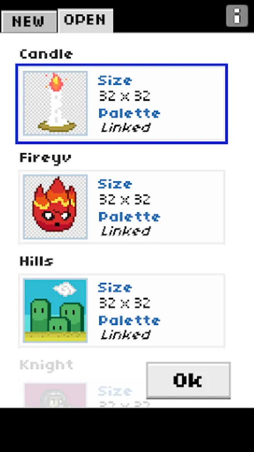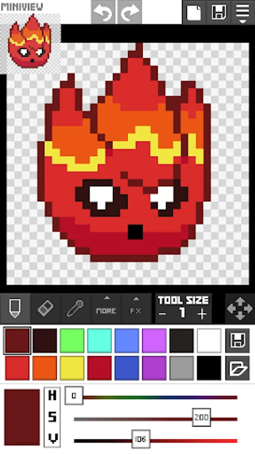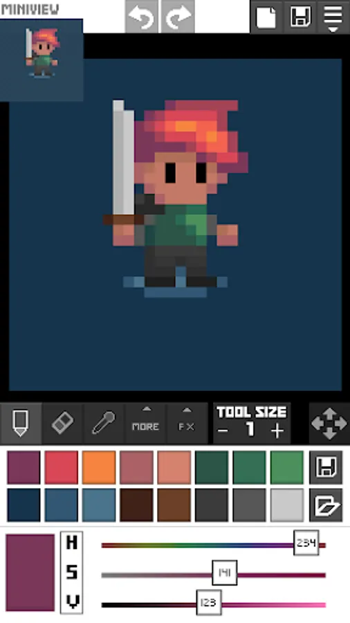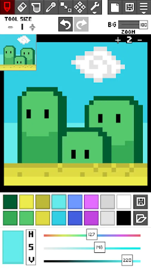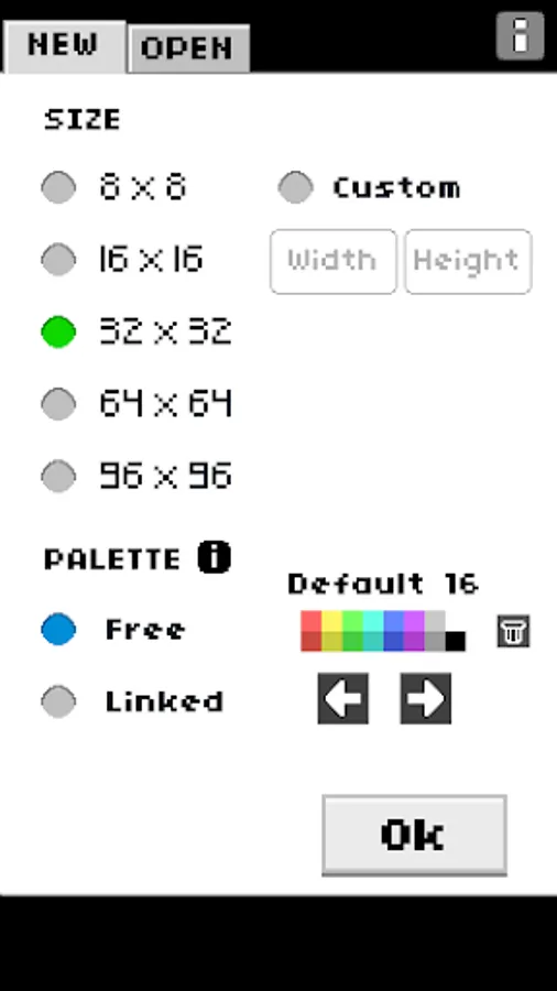 - Linked palette to the canvas up to 16 colors or free colors drawing