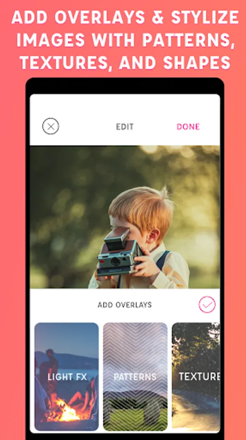 ⭑ Impress your friends by applying a collection of hundreds (and growing) of shapes, borders, overlays, textures, light leaks, and gradients to add that extra flair to your photos.