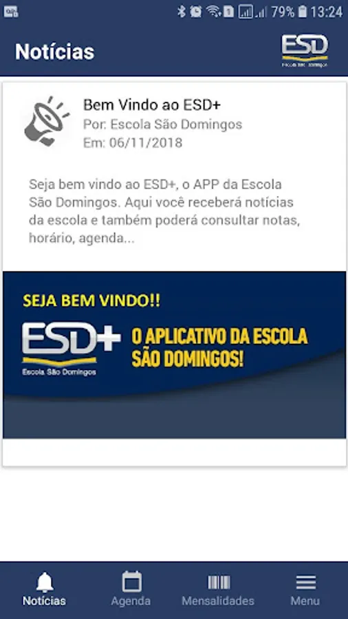 Application of Escola São Domingos, which allows for bulletin consultations, monthly fees, school hours, disciplinary follow-up, besides having a school agenda and news bulletin for an efficient communication between the school, students and parents.
