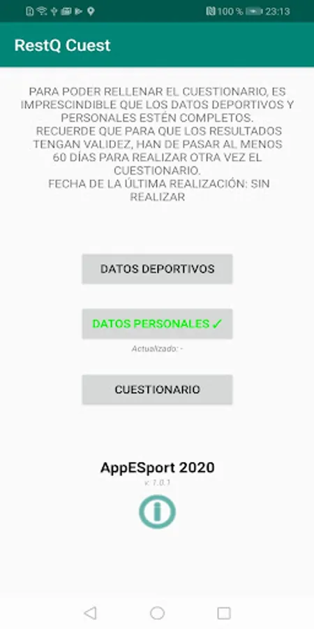 The Application does not collect identity data, but personal data such as gender, age, sport, test, sport level, and frequency and duration of training. These data allow us to analyze the relationship of these variables with stress and sports recovery, allowing to identify how they are related to overtraining and thus contribute to its prevention.