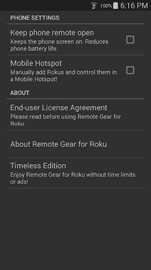 Upgrade to the Timeless Edition to control your Roku devices without time limits. In the free version, the phone app contains ads and the watch app offers a 5 minute trial. After the trial period you can close the watch app and start a new 5 minute trial!