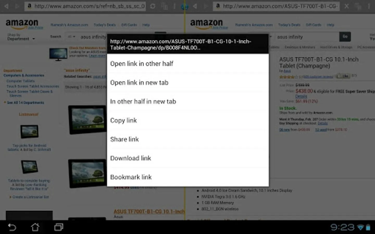 • Open links and bookmarks in the other half and/or in a new tab.