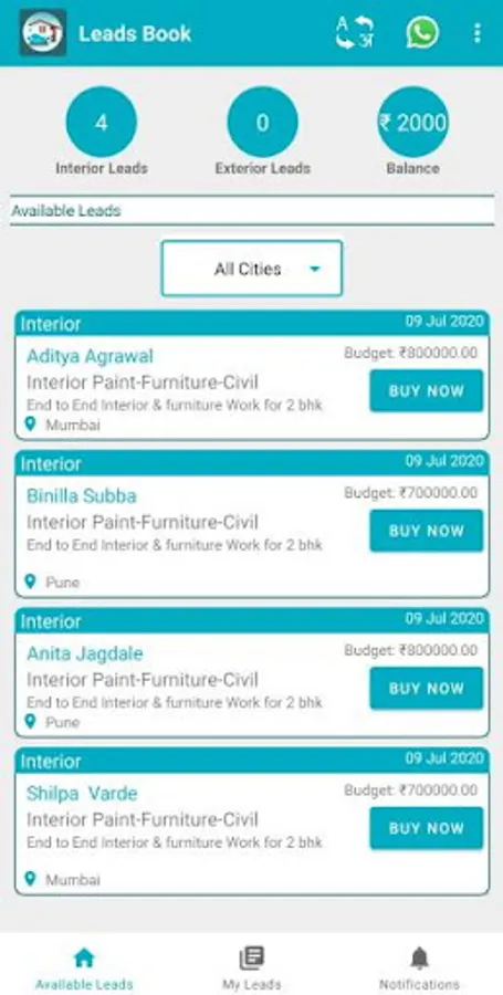 At Leadsbook, we provide you verified Leads in Interior / Exterior / Civil segment.
