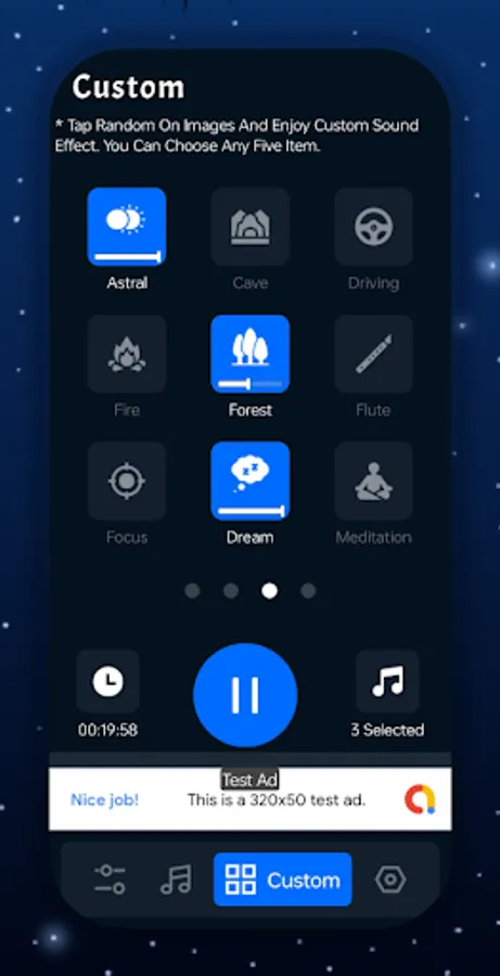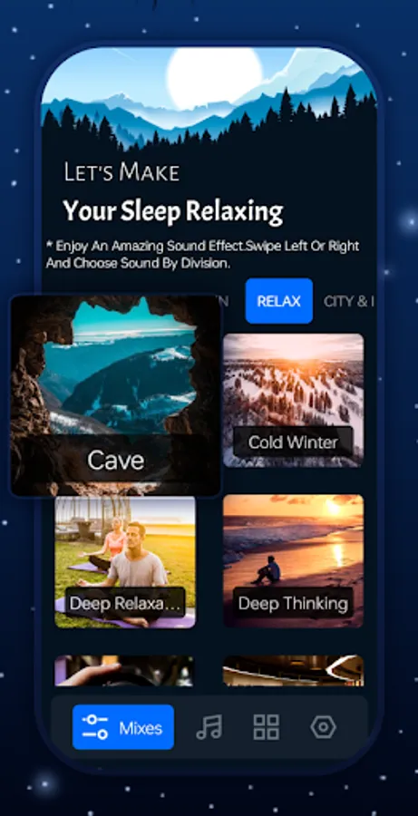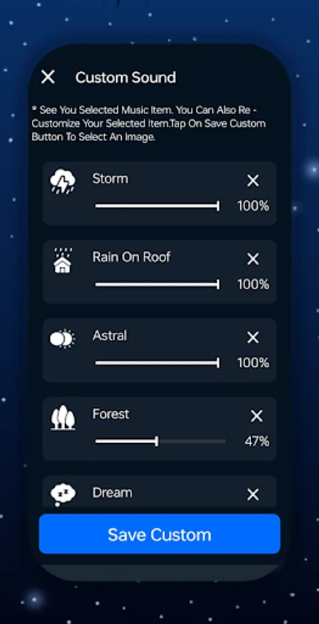 With Sleep Music, you can easily create personalized mixes of sleep sounds that resonate with you. Choose from a wide array of sleep-inducing options, including gentle melodies, nature sounds, rain sounds, meditation sounds, and white noise. Customize each sound's volume to create your own unique blend, tailored to your preferences.