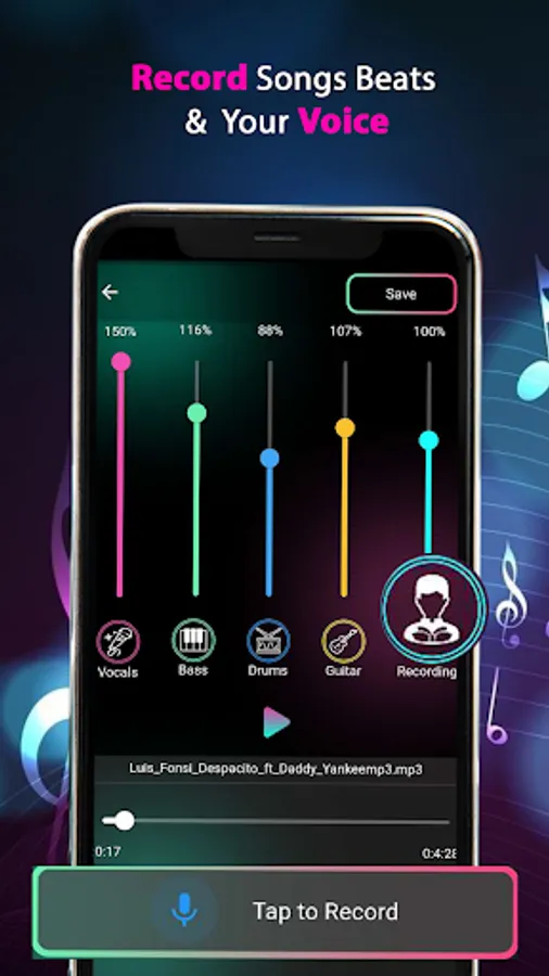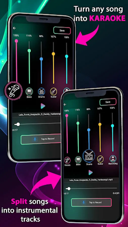 Transform your device into a karaoke machine and sing along to your favorite tunes. Just upload any mp3 file and remove the vocals from song to make a quality backing track. Record yourself singing along and share with your friends. To get your singing more accurate, you can keep the original singer audible while recording and remove the vocals completely afterwards. Split Beat vocal remover allows you to enjoy a personalized karaoke experience.