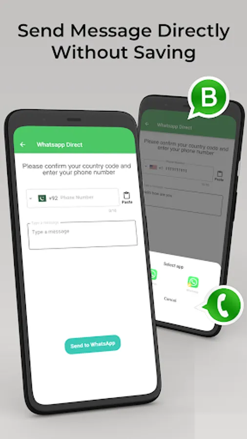 • Send Direct message on Whatsapp App & Whatsapp Business without saving contact