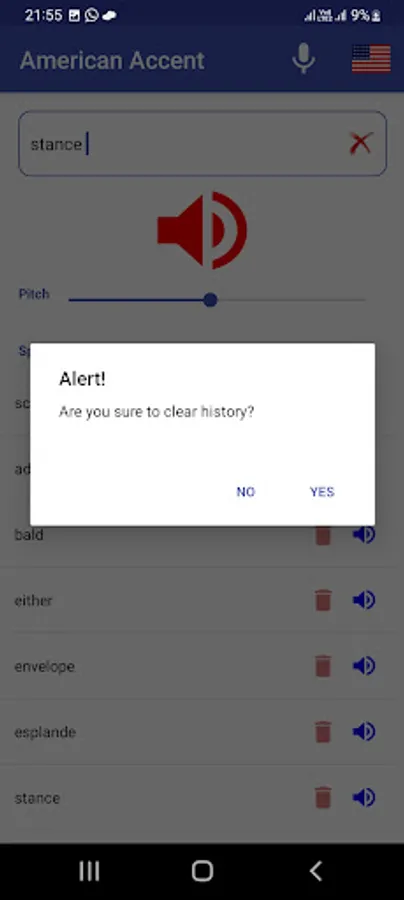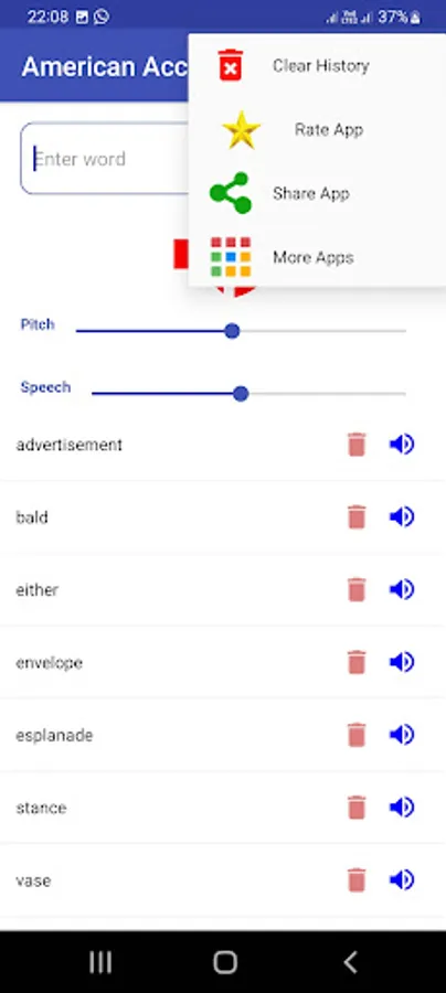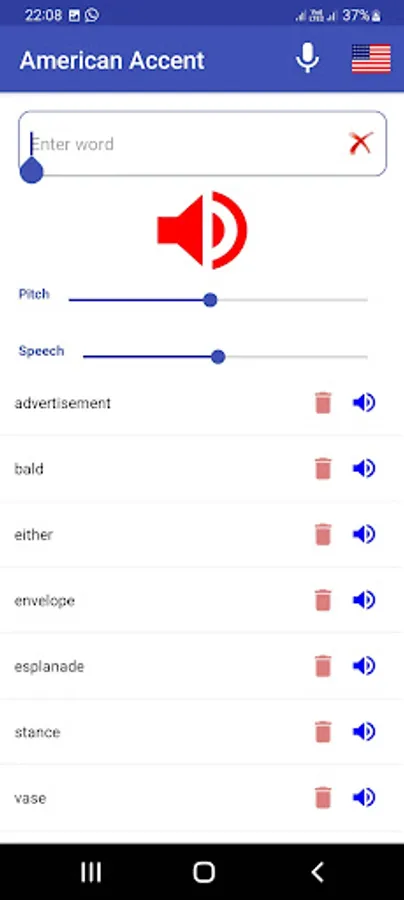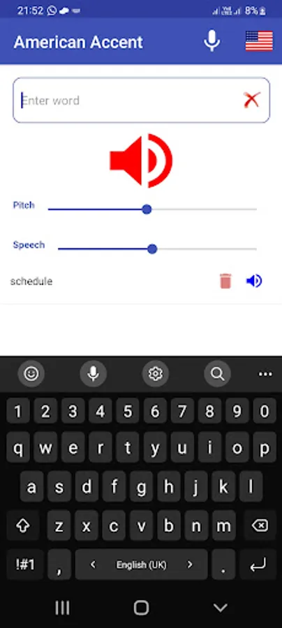 Type or speak your words and press the speaker button. Listen carefully to the pronunciation of words. The App keeps your word history. Later on you can listen again and again and try to speak. You can delete single word or all words from list any time. Listen pronunciation of the following words in American ascents: Schedule, Buoy, Clique, Esplanade, Niche, Privacy, Route, Tomato, Vase, Zebra.