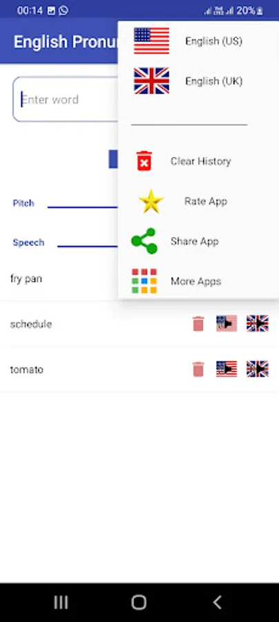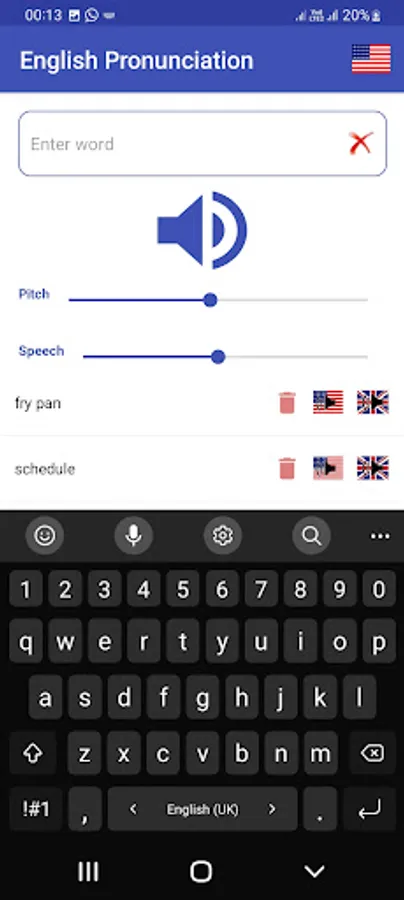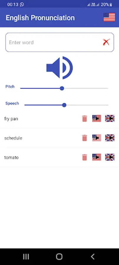 Select American or British ascents by choosing flag from setting. Type your word and press speaker button. Listen pronunciation carefully. App keeps your words history, later on you can listen again and again and try to speak. You can delete single word or all words from list any time. Listen pronunciation of the following words in American and British ascents and understand the difference: Buoy, Clique, Esplanade, Niche, Privacy, Route, Schedule, Tomato, Vase, Zebra.