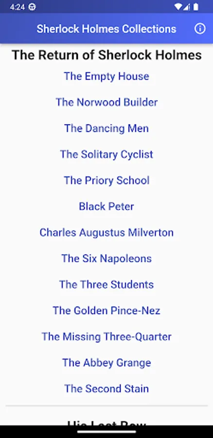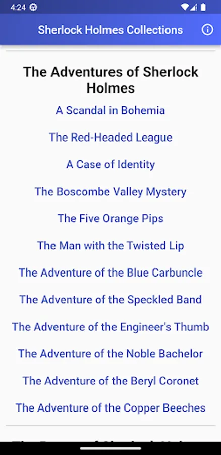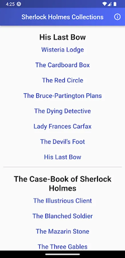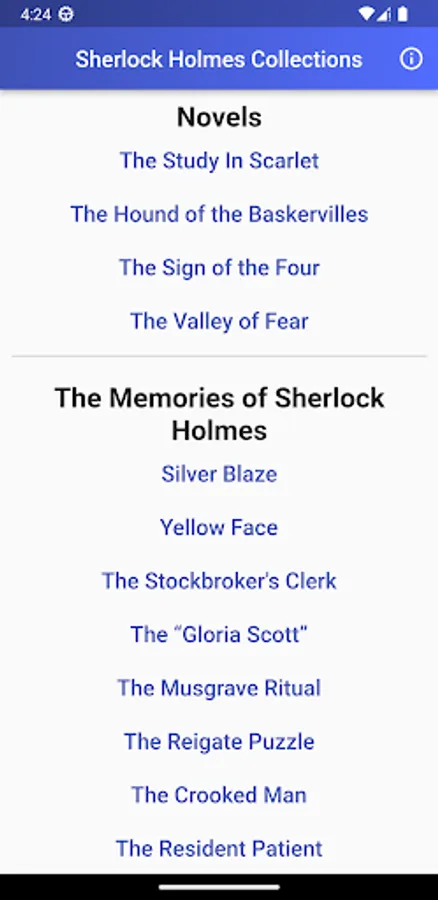This app contains complete collection of Sherlock Holmes Novels according to the following categories.