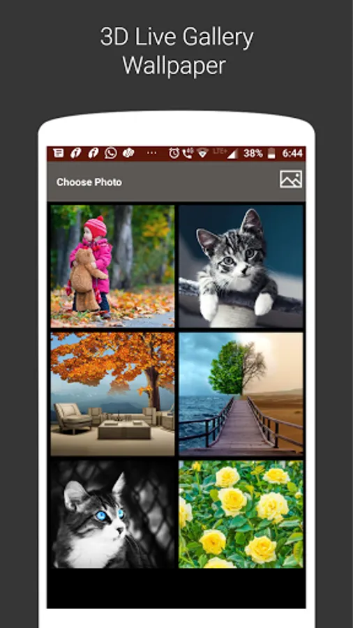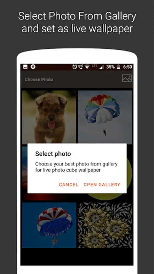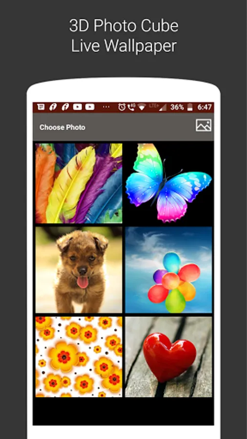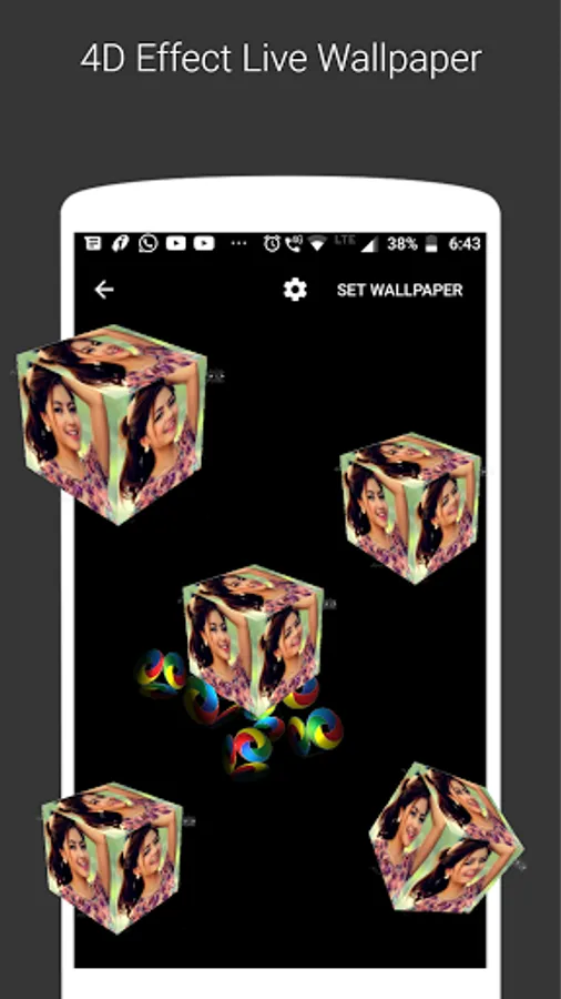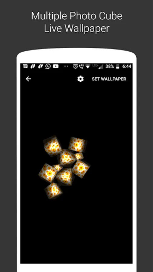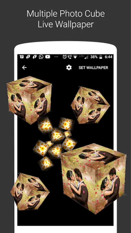 Just choose photo from gallery and you will see the 5 to 10 3d cubes with selected photo on screen as live wallpaper preview and now you can set as lock & home screen live wallpaper