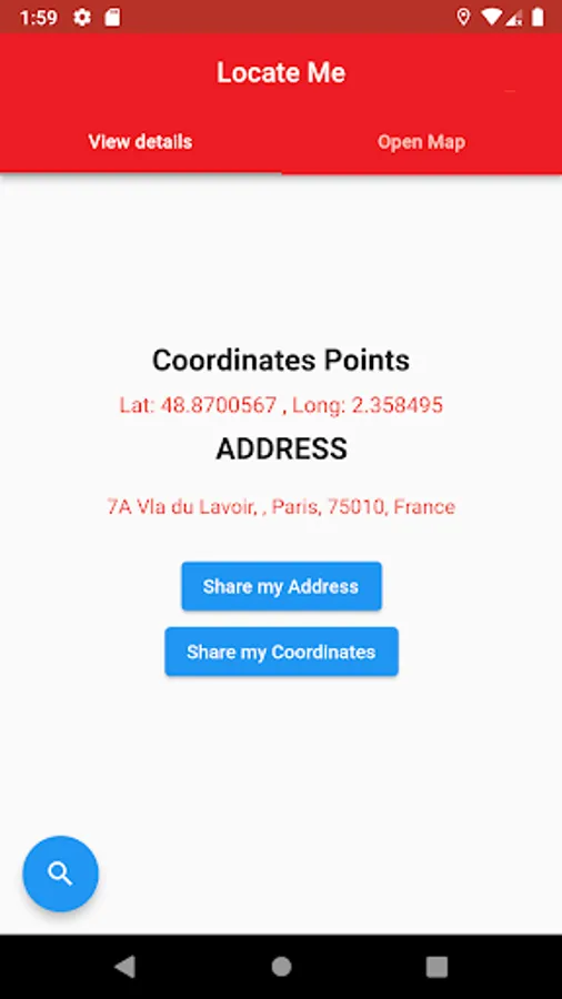 "Locate Me" is a android app which you allows to track your location. It will show you the coordinate points and the address of the location. Not only the address, but also it can show your location on map in different modes. You can share your location instantly to social media if needed.