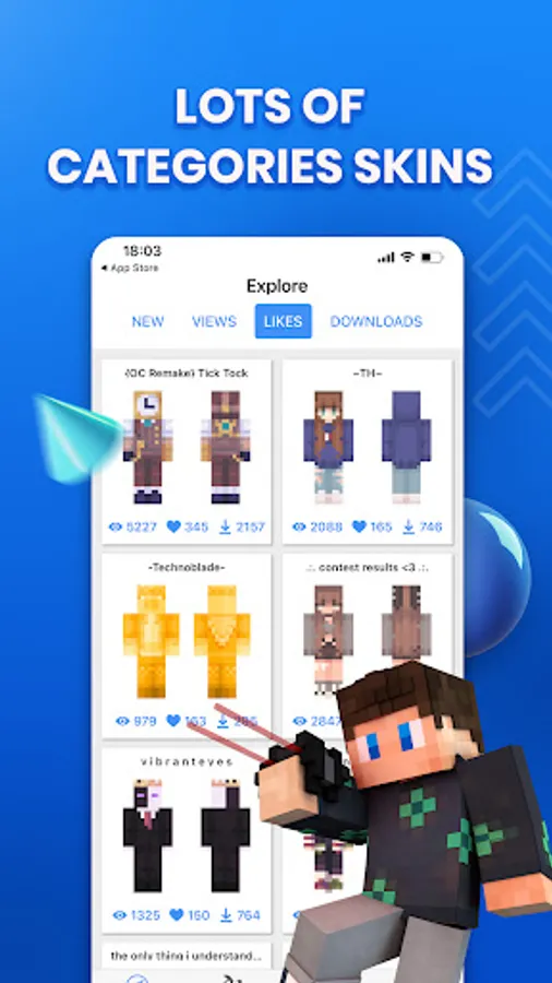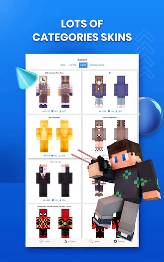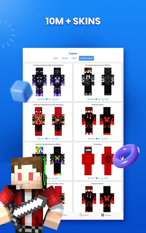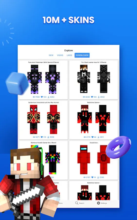# More than thousands of high qualities, fully searchable skins are integrated in the app for your use. You can select as many as you like and create your own custom skin for Minecraft.