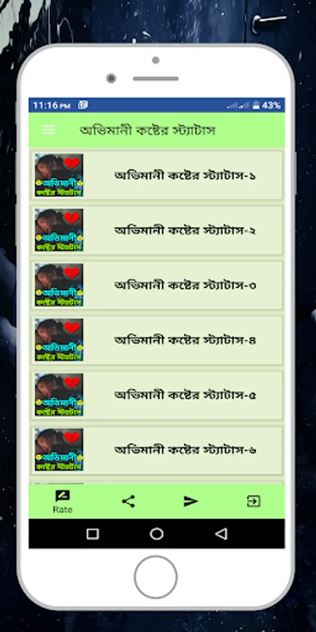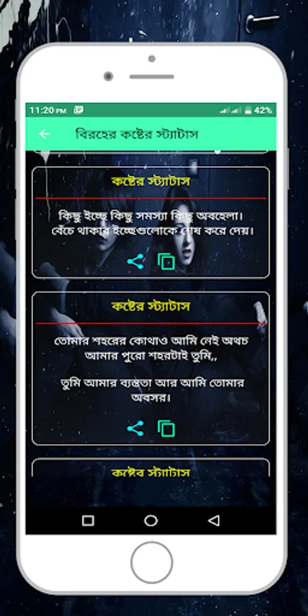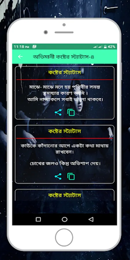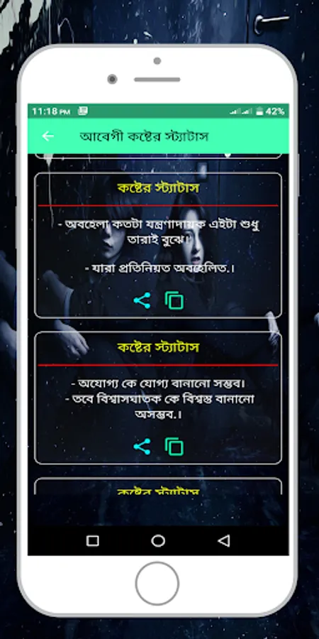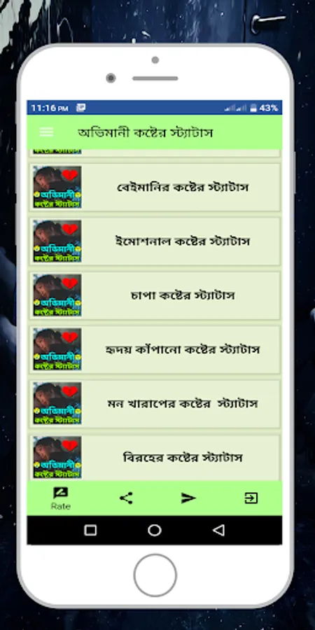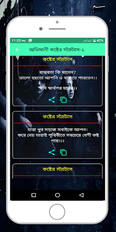 অভিমানী কষ্টের স্ট্যাটাস এই অ্যাপসটি থেকে সকল ধরনের কষ্টের এস এম এস ও স্ট্যাটাস পাবেন। আপনার মনের অনেক ধরনের কষ্ট থাকতে পারে এক মাএ এই অ্যাপসটি থেকে সকল ধরনের দুঃখ স্ট্যাটাস পাবেন। যা অনলাইনে শেয়ার করে মনের কষ্টটারে একটু দূর করতে পারবেন। অভিমানী কষ্টের স্ট্যাটাস-sad status post.