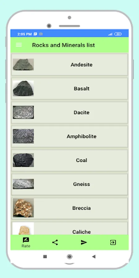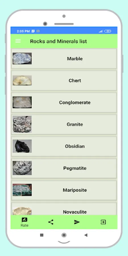 Rocks and Minerals list From this app you can find out about Rocks and Minerals. Learn more about some of the important Rocks and Minerals. This Rocks and Minerals list book contains about rock types and minerals with colors and shapes to make simple and accurate identification. Hopefully there will be a lot of ideas from the apps.