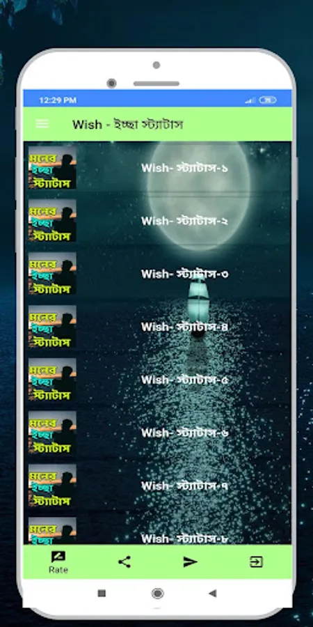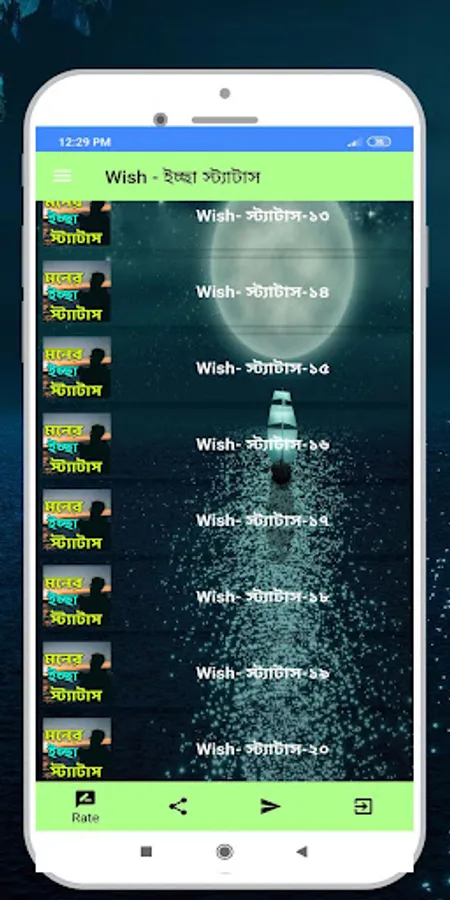 Wish - ইচ্ছা স্ট্যাটাস এই অ্যাপসটির মাধ্যমে আপনি আপনার মনের কিছু ইচ্ছা স্ট্যাটাস দিয়ে মানুষকে বুঝাতে পারবেন।এই অ্যাপসটিতে ছোট করে ইচ্ছে গুলো দেয়া আছে যা আপনার মনের সাথে মিল। এস এম এস, পোষ্ট আর ক্যাপশন দিতে পারবেন। মজার কিছু ইচ্ছার উক্তি পাবেন।Wish - ইচ্ছা স্ট্যাটাস- mojar status SMS পাবেন।