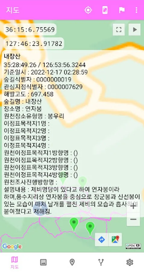 Point of interest identifier, forest path identifier, forest path name, latitude, longitude, altitude above sea level, source location type name, source location type code, location name, explanation content, standard date and time, original source investigation direction name , Milestone destination name, source milestone destination direction name, source milestone destination code information is provided.