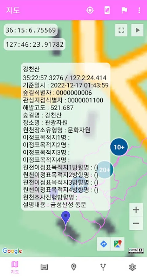 Point of interest identifier, forest path identifier, forest path name, latitude, longitude, altitude above sea level, source location type name, source location type code, location name, explanation content, standard date and time, original source investigation direction name , Milestone destination name, source milestone destination direction name, source milestone destination code information is provided.