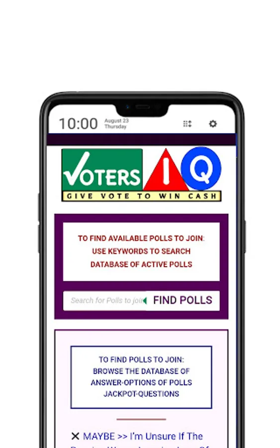 VotersIQ polls/surveys are simply opinion polls that can be completed within 15 minutes and the results are published in-app on daily basis with the winners being selected by the voters on the basis of answer options with the highest, lowest and average votes cast. The group of voters who voted the answer option that the majority of the voters voted as the winning option will get to share the total cash prize of the poll equally.