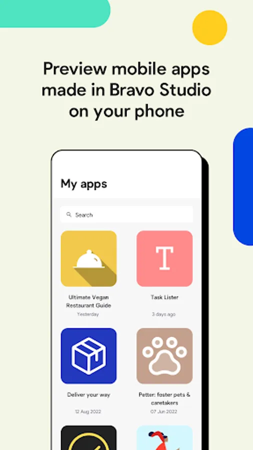 Bravo Vision is the companion app to Bravo Studio which allows you to view and interact with your Bravo projects on your Android device. This app requires you to log in with your Bravo account (www.bravostudio.app) in order to see your projects.