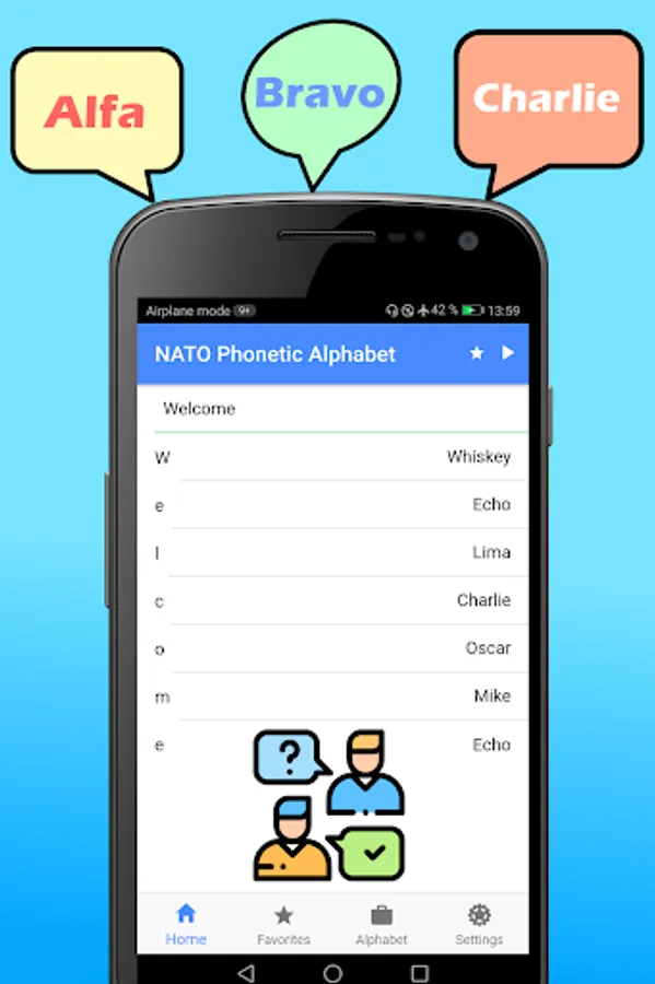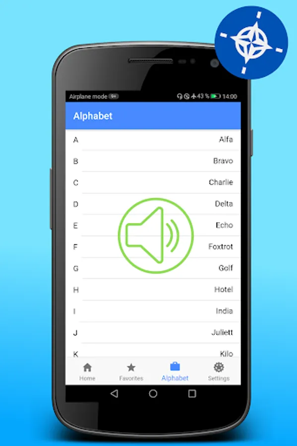 •• Just type a word and it will be spelled automatically with code words: Alfa, Bravo, Charlie, Delta... ••