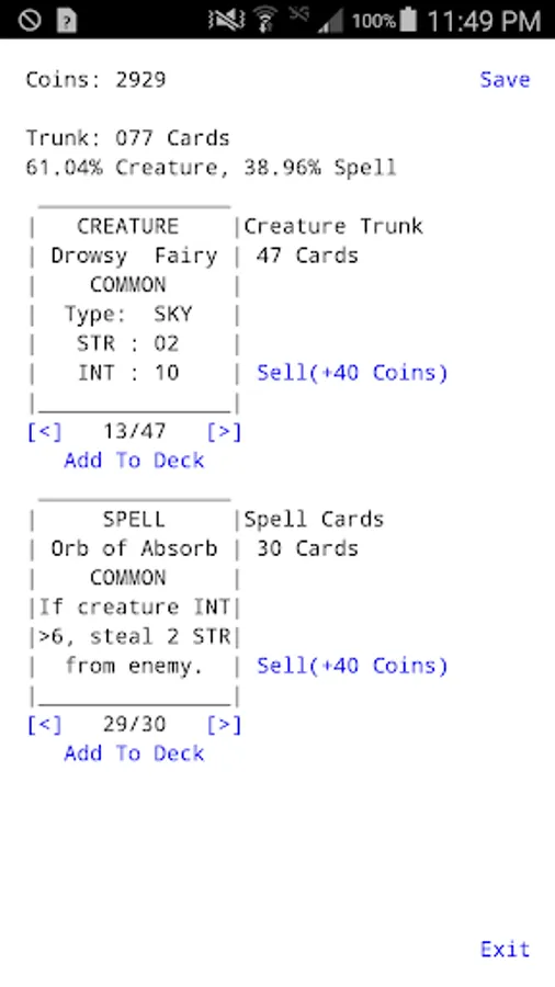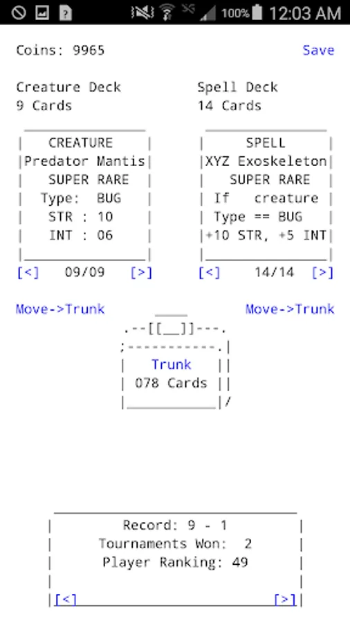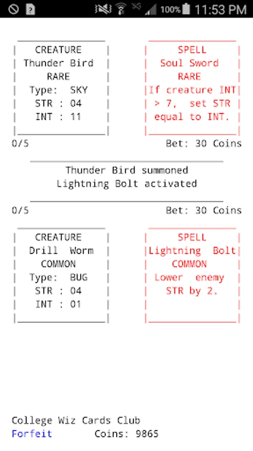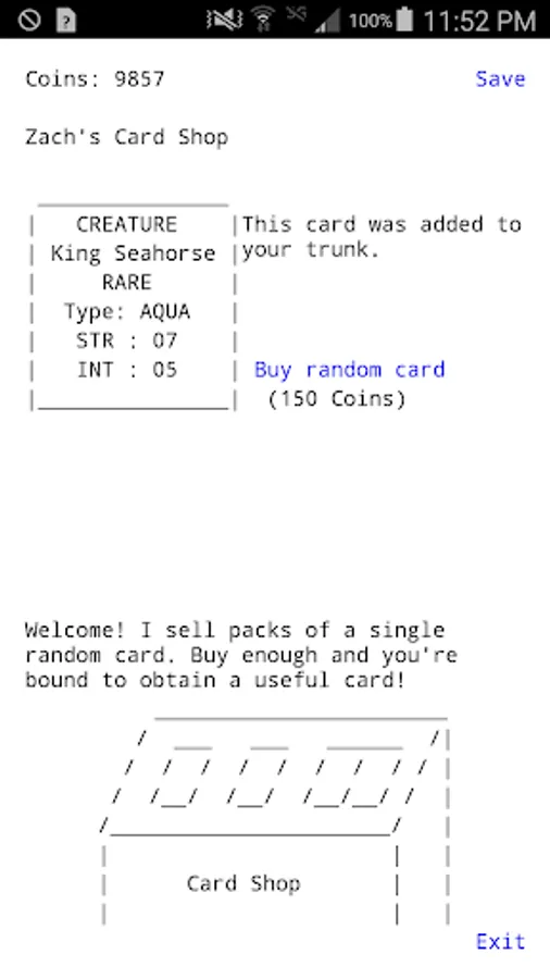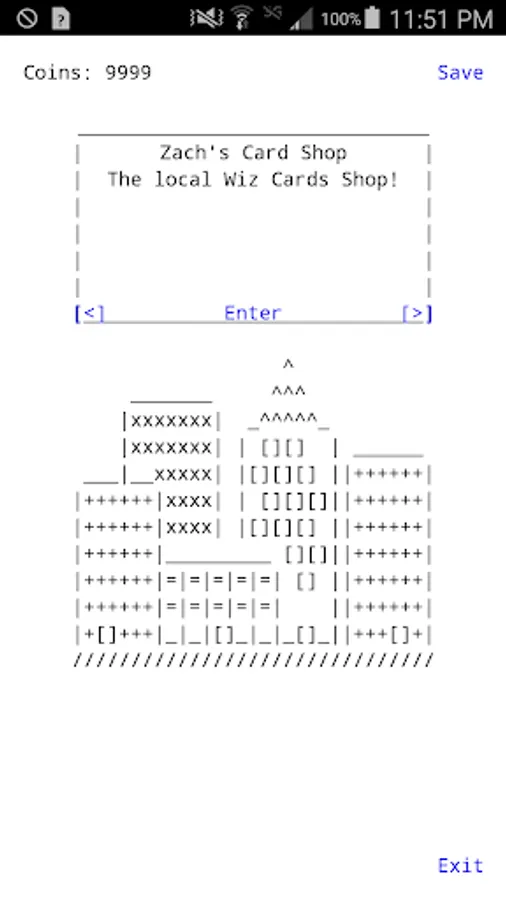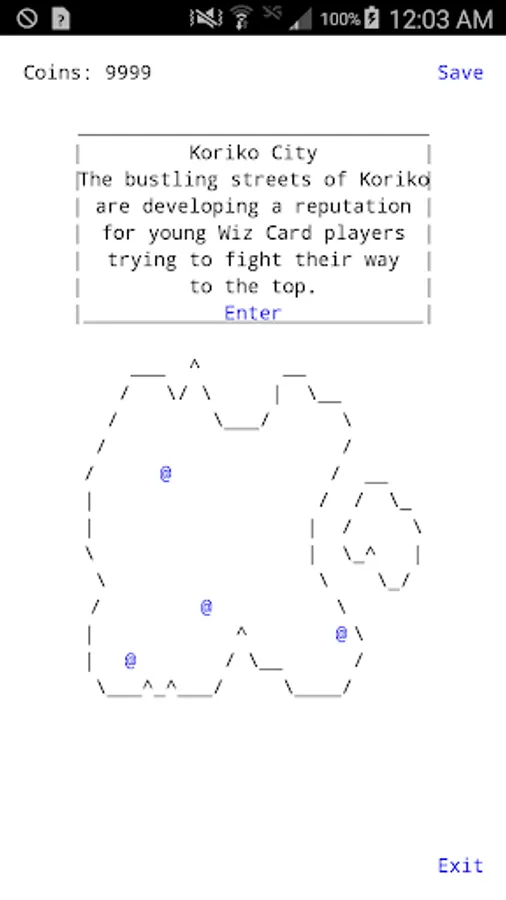 This unique ASCII-art, idle game challenges you to collect and build your Wiz Cards deck. There are 100 Wiz Cards to be acquired! Take on players in various cities on the game map and earn your spot as the number 1 ranked player.