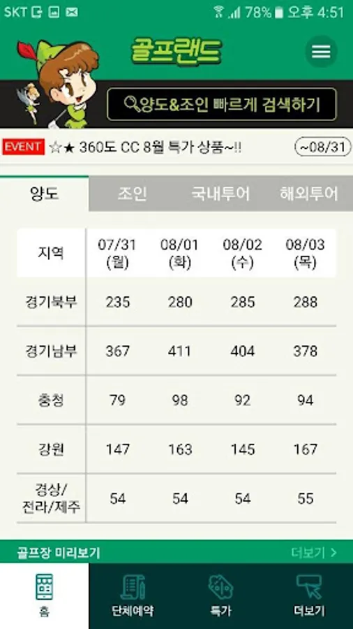 골프장 예약과 조인, 미리보기, 위치검색, 할인가를 간편하게 조회할 수 있으며, 부킹매니저를 통해 실시간 예약과 상담이 가능합니다. (홈페이지:http://www.golfland.co.kr)