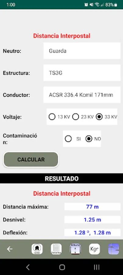 Here you select the type of structure (TS, RD, HA), if it is neutral or guard, the conductor gauge and the operating voltage, as well as if it is a contaminated area or not.