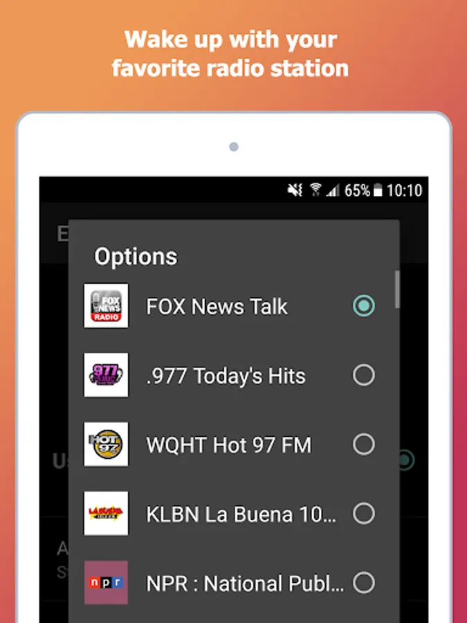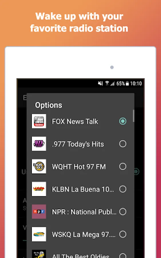 myAlarm is the best alarm clock app for Android. If you want to wake up listening to your favorite radio station or keep up with the latest news, myAlarm Clock is the right alarm app for you. Plus, it has a lot more features that allow you to customize your wake up experience. Sleep better, wake up easier and be always on time!