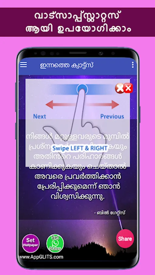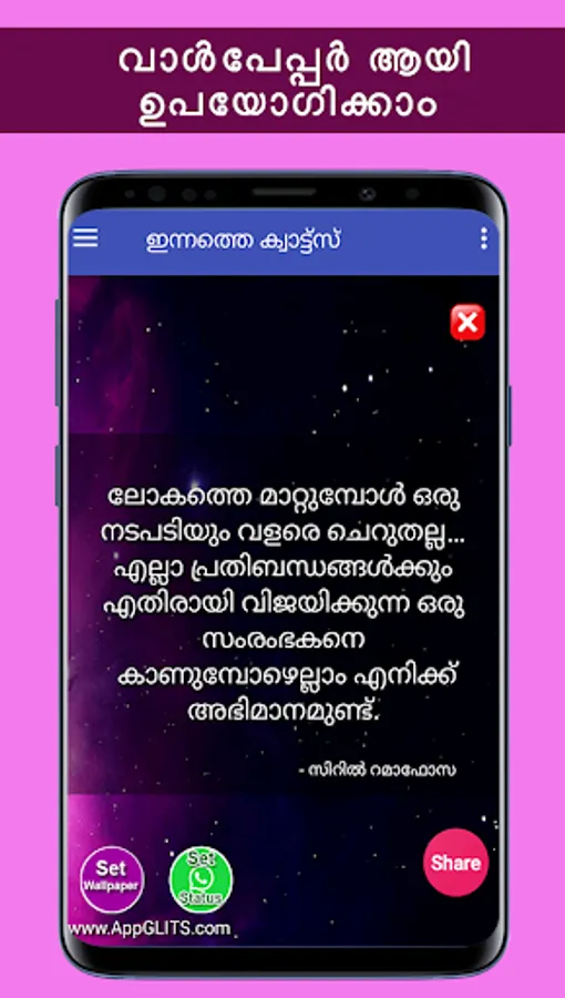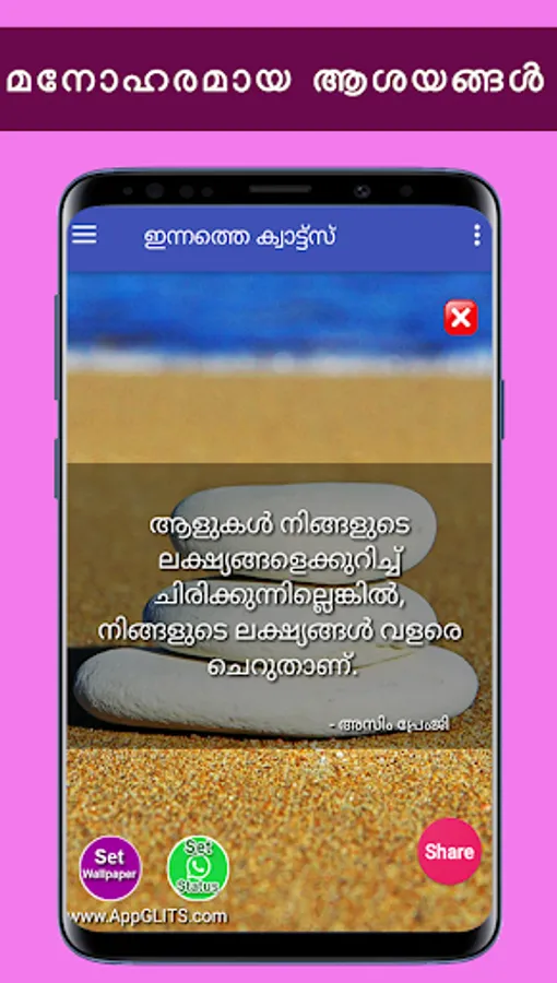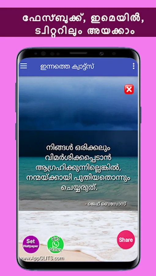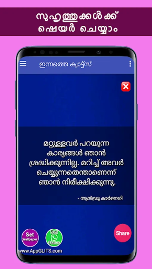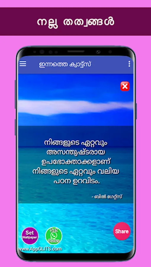 Namaskaram! Ella malayalikalkkum namaskaram.Ee android aplicationil billionaires paranjittulla allenkil avarude lifil ninnum namukk ere upayogapradhamaya quotesukalanu ulppeduthiyirikkunnath. koodathe ee quotesukal nammude munnottulla jeevithathinu valare prachodhanavum nalkunnavayumanu. Ee applicatione nigalude friends, relatives ellavarkkum whatsapp,facebook,email,twitter thudagiya social media vazhi share cheyyuka.