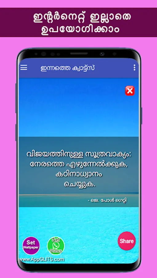 അനുഭവത്തിൽ നിന്നുള്ള വാക്കുകൾ നമ്മുടെ ജീവിതങ്ങളെ പലവിധത്തിലും സ്വാധീനം ചെലുത്തുന്നുണ്ട്. അവ നമുക്ക് പ്രചോദനവും ഉന്മേഷവും ലഭ്യമാക്കുന്നു. ഈ ആൻഡ്രോയിഡ് ആപ്ലിക്കേഷനിൽ ശതകോടീശ്വരന്മാർ പറഞ്ഞ വാക്കുകളാണ് ഉൾപ്പെടുത്തിയിരിക്കുന്നത്. നമ്മുടെ ജീവിതത്തിൽ വരുന്ന പ്രതിസന്ധികളെ മറികടക്കാൻ ഇതുപോലുള്ള തത്വങ്ങൾ ഏറെ ആവിശ്യകരവുമാണ്. ഇത് എല്ലാവർക്കും ഒരുപോലെ ഉപയോഗപ്രദവുമാണ്. കൂടാതെ ഇത് നിങ്ങളുടെ കൂട്ടുകാർക്ക് ഷെയർ ചെയ്യാനും Whatsapp സ്റ്റാറ്റസ് ആയി കൂടെ വക്കാവുന്നതുമാണ്. ഈ ആൻഡ്രോയിഡ് ആപ്ലിക്കേഷൻറെ notifications നിങ്ങൾക്ക് ക്രമീകരിക്കാം. ഇതിലുള്ള കോട്ട്സ് Whatsapp, Facebook, twitter, email ഇതുപോലുള്ള Social Media-കളിലും ഷെയർ ചെയ്യാവുന്നതാണ്. ഈ ആപ്ലിക്കേഷൻ ഇന്റർനെറ്റ് ഇല്ലാതെയും ഉപയോഗിക്കാം. പ്ലേ സ്റ്റോറിൽ ഞങ്ങൾക്ക് 5 സ്റ്റാർ റേറ്റിംഗ് നൽകി സഹായിക്കുക. നന്ദി..