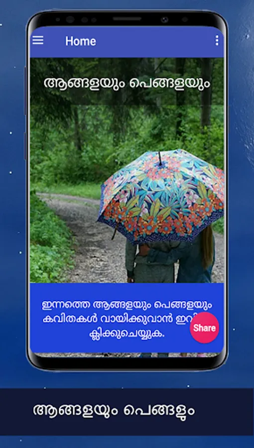 Namaskaram!Ella malayalikalkkum Namaskaram.Ee Android applicationil angalayum pengalum thammilulla chila aashayangalanu ulppeduthiyirikkunnath. Ee applicatione nigalude friends,relatives ellavarkkum Whatsapp,Facebook,Email,twitter thudagiya social media vazhi share cheyyuka.