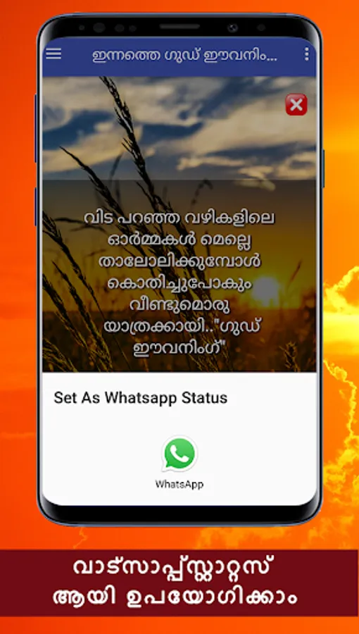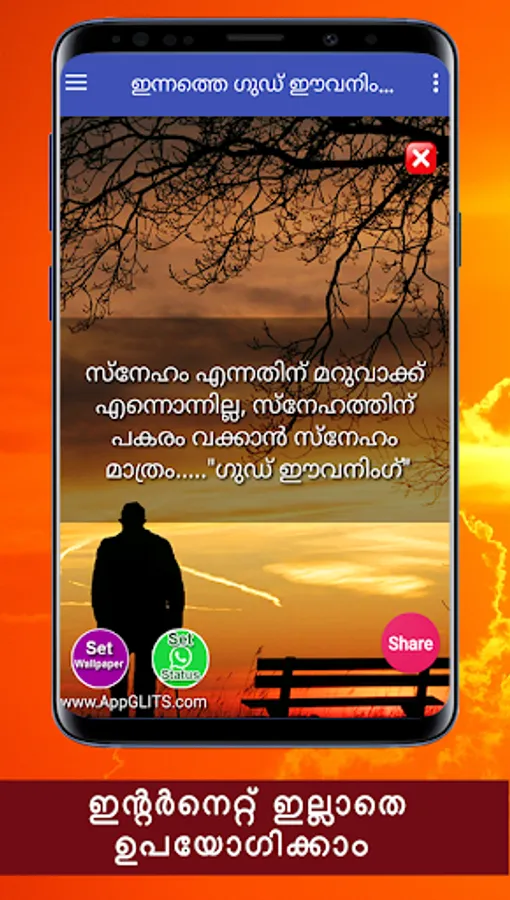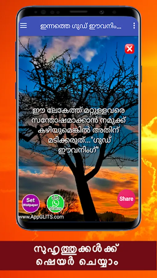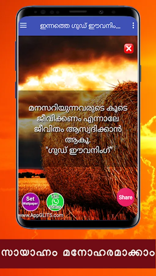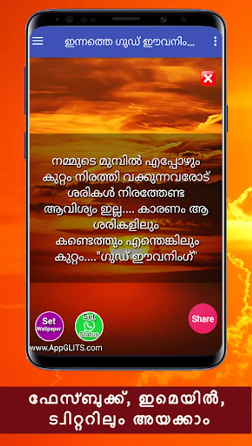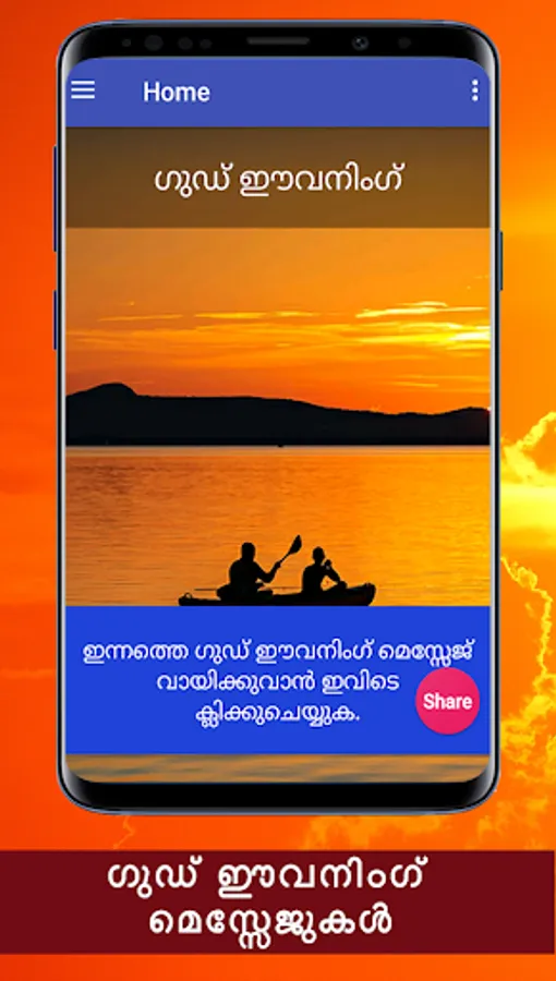 Namaskaram! Ella malayalikalkkum namaskaram. Ee android applicationil sayahnna velakalil allenkil vaikunnerangalil unmeshavum anandhavum nalkunna chila good evening messagukalanu ulppeduthiyirikkunnath. Ee applicatione nigalude friends,relatives ellavarkkum whatsapp, facebook, email, twitter thudagiya social media vazhi share cheyyuka.