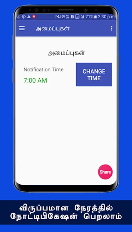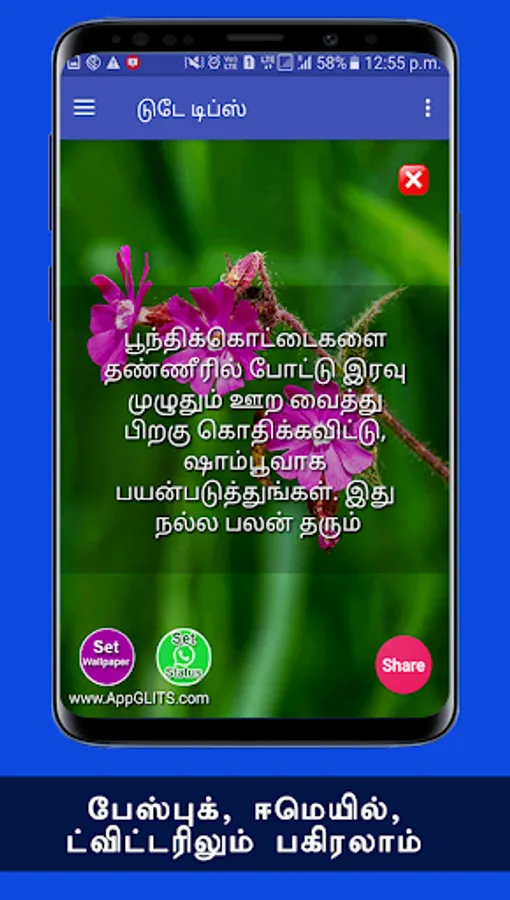 இதற்காகவே இந்த ஆன்ட்ராய்டு செயலியை உருவாக்கி உள்ளோம். இந்த செயலி வழியாக நீங்கள் மற்றும் உங்கள் நலம் விரும்பிகளுக்கு தேவையான பல விஷயங்களை இலவசமாக பெறலாம். நண்பர்களே!! இந்த செயலியின் மூலம் உங்களுக்கு விருப்பமான நேரத்தில், முடி வளர்வதற்கான குறிப்புகளை மொபைல் போனில் நோட்டிபிகேஷனாக பெறலாம். இன்னும் ஒரு நல்ல விஷயம் என்னவென்றால், வாட்சப், பேஸ்புக், டிவிட்டர், ஈமெயில் வழியாவும் உங்கள் நண்பர்களுக்கு ஷேர் பண்ணலாம்.