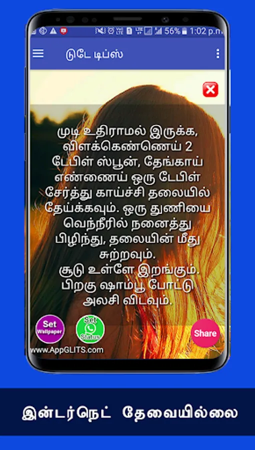 These mudi valarvathu eppadi in tamil is change our hair falling problems. Here You can get mudi valarpathu eppadi tamil tips for all. mudi adarthiyaga valara eppadi tips in tamil download is very useful for share many tips to whatsapp, facebook, instagram, e mail, telegram etc. Daily You can see the thalai mudi valarvathu eppadi in this android app. In this app we show mudi valara eppadi in tamil. In this app we will give you mudi valara eppadi tamil in tamil. In this app we show beauty tips for mudi valara kurippu in tamil with hd wallpapers etc. In this app we will tell about mudi valara kurippugal. Here in this you will get hair fall problems and solutions tamil download things. Please share this app to your friends & family members and tell to install our app.