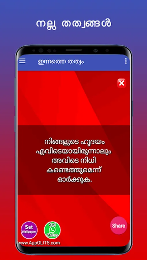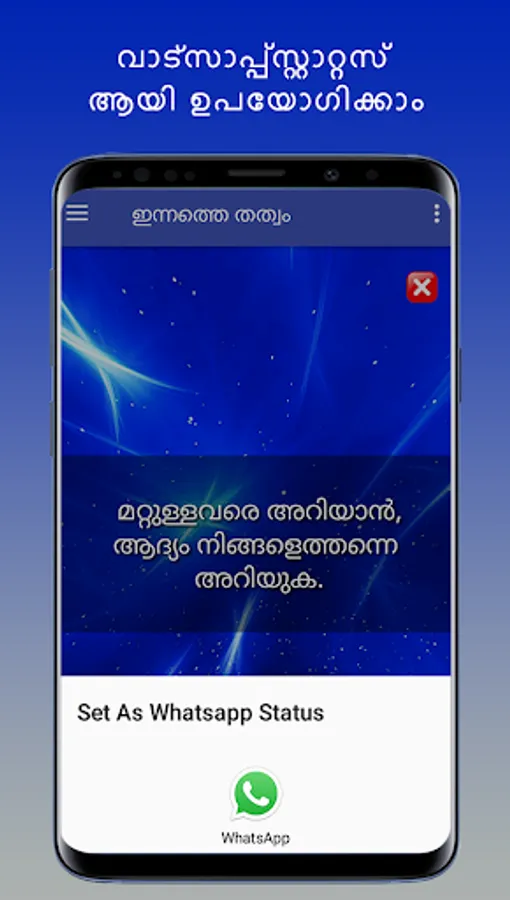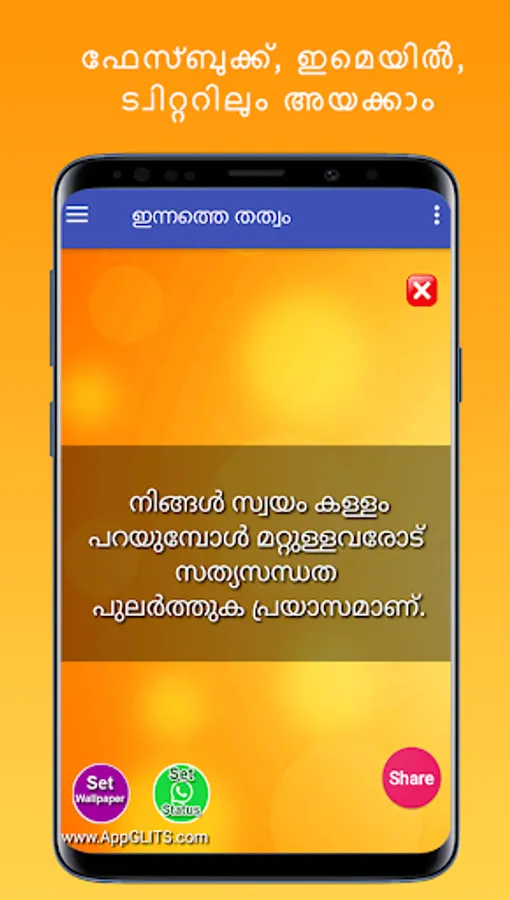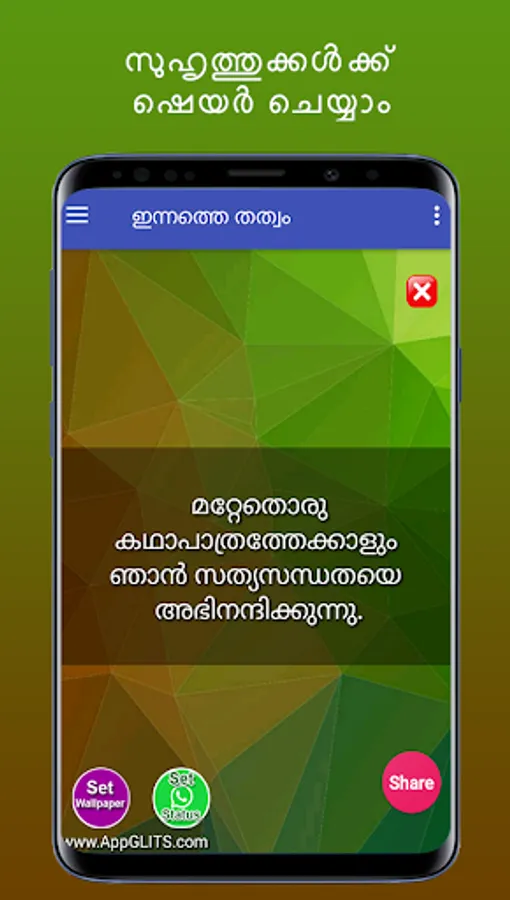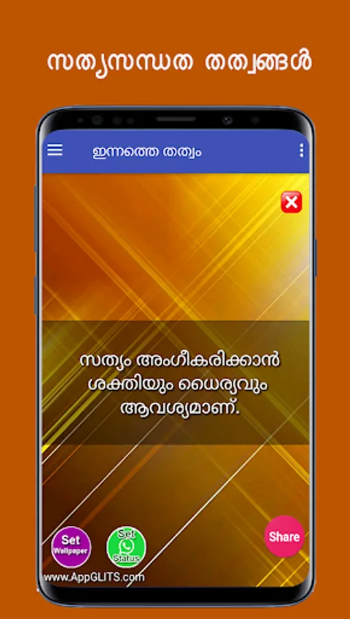 മനുഷ്യ ജീവിതത്തിൽ വേണ്ട വളരെ വിലപ്പെട്ട കാര്യമാണ് സത്യസന്ധത. സത്യസന്ധതയിലൂടെ ഒരു വ്യക്തിയുടെ വില നിർണ്ണയിക്കാൻ കഴിയും. അതിനായി നല്ലൊരു ജീവിതം മെച്ചപ്പെടുത്താൻ ഈ ആൻഡ്രോയിഡ് ആപ്ലിക്കേഷൻ ഏറെ സഹായിക്കും. ഇതിൽ സത്യത്തെയും അസത്യത്തെയും തിരിച്ചറിയാനുള്ള തത്വങ്ങളാണ് ഉൾപ്പെടുത്തിയിരിക്കുന്നത്. കൂടാതെ ഇത് നിങ്ങളുടെ കൂട്ടുകാർക്ക് ഷെയർ ചെയ്യാനും Whatsapp സ്റ്റാറ്റസ് ആയി കൂടെ വക്കാവുന്നതുമാണ്. ഈ ആൻഡ്രോയിഡ് ആപ്ലിക്കേഷൻറെ notifications നിങ്ങൾക്ക് ക്രമീകരിക്കാം. ഇതിലുള്ള തത്വങ്ങൾ Whatsapp, Facebook, twitter, email ഇതുപോലുള്ള Social Media-കളിലും ഷെയർ ചെയ്യാവുന്നതാണ്. ഈ ആപ്ലിക്കേഷൻ ഇന്റർനെറ്റ് ഇല്ലാതെയും ഉപയോഗിക്കാം. പ്ലേ സ്റ്റോറിൽ ഞങ്ങൾക്ക് 5 സ്റ്റാർ റേറ്റിംഗ് നൽകി സഹായിക്കുക. നന്ദി..