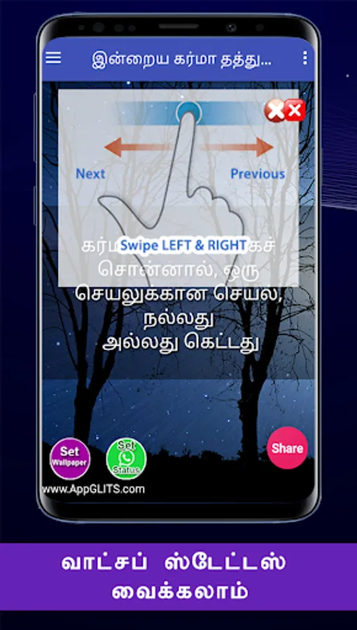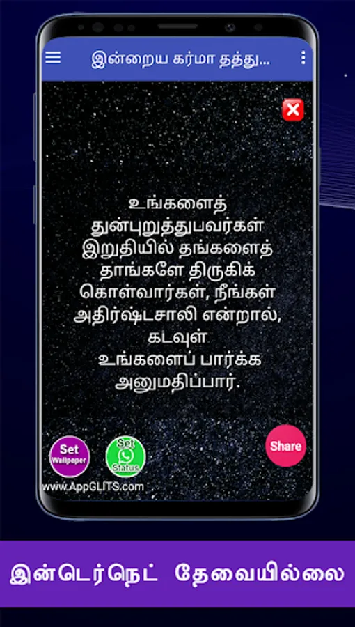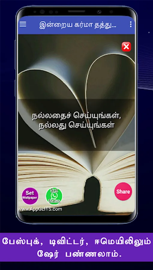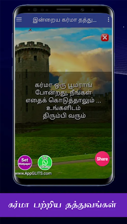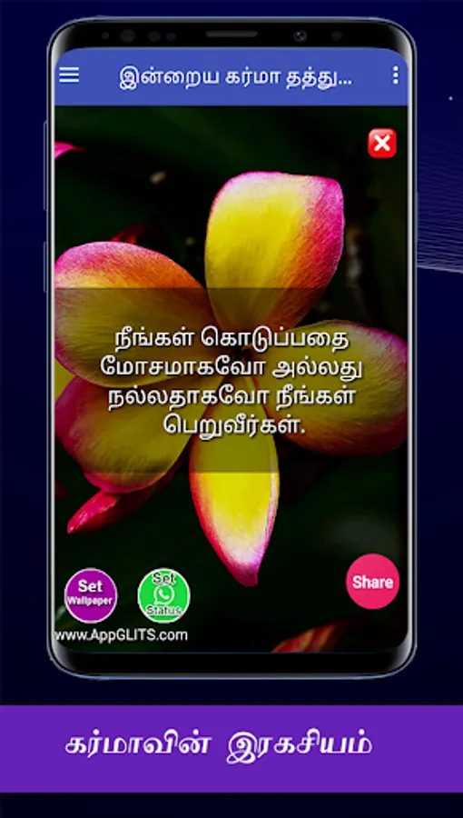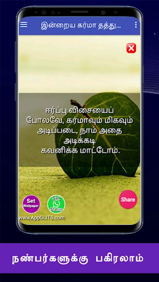 இந்த கர்மா தத்துவங்களை நீங்கள் பெற்று பயனடைவதோடு இல்லாமல் உங்கள் நலம் விரும்பிகள் எல்லாருக்கும் வாட்ஸப்பில் ஷேர் பண்ணுங்க. அதன் மூலம் அவர்களும் பயனடைவார்கள். இந்த செயலியின் மூலம் உங்களுக்கு விருப்பமான நேரத்தில், கர்மா தத்துவங்களை மொபைல் போனில் நோட்டிபிகேஷனாக பெறலாம். மேலும் வாட்சப், பேஸ்புக், டிவிட்டர், ஈமெயில் வழியாவும் உங்கள் நண்பர்களுக்கு ஷேர் பண்ணலாம்.