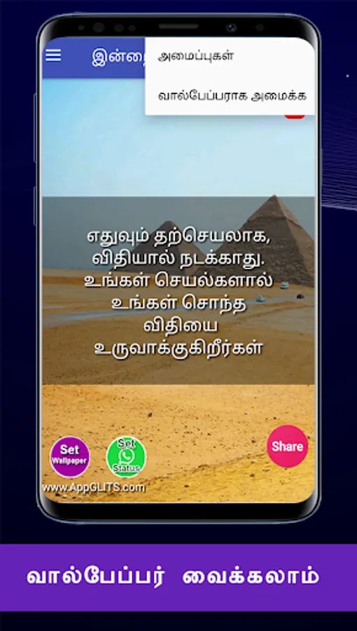 Hai friends !! Its an very simple karma quotes tamil app. Here you can get discipline quotes in our tamil language. You can share these tamil motivational quotes in all social media. Also some features of our app is karma and you will be getting positive approach. You can share hope quotes about life and many more. Here in this app let you know about how to get karma quotes and get inspirations. Here you can get tamil sad quotes with nice images. Don't miss this friends !! In this android app simple peace quotes tamil share to all your friends. Here you can get karma meaning in tamil etc. Spend the time to read losing hope quotes is very useful for our mind. You can see karma meaning in english and many more. Daily you can see the karma status tamil. In this app we show karma tamil meaning about life. Here let you know about how to get tamil thathuvangal and get motivations. Also some features of our app is tamil ponmozhigal and etc. Here in this app let you know about how to short quotes about life and get inspirations. Daily you can see the karma quotes images and get motivations. In this app we show hope for the best quotes with super background images. Here let you know about how to find peace of mind quotes tamil and get inspirations. These bad karma quotes about life tamil will realize our daily problems. You can share self discipline quotes and many more. Also here you can get karma palan quotes in tamil etc. You can see karma meaning in tamil with example. Also you share many lesson of karma quotes to your favouite one. Here you can get money karma in tamil for our life and many more things about our daily life. So stay tuned our app and get the success quotes tamil via our simple tamil android application.