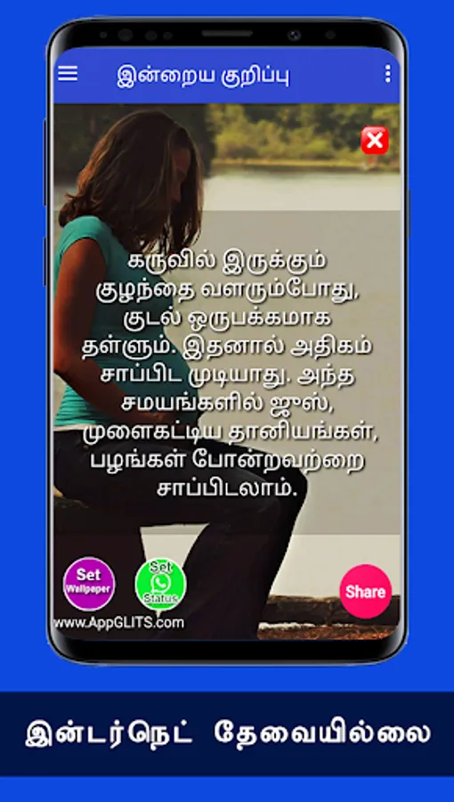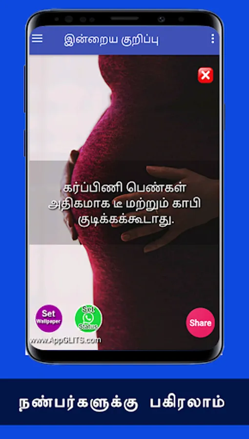 இதற்காகவே இந்த ஆன்ட்ராய்டு செயலியை உருவாக்கி உள்ளோம். இந்த செயலி வழியாக கர்பிணிகள் நலன் பற்றிய குறிப்புகளை இலவசமாக பெறலாம். நண்பர்களே!! இந்த செயலியின் மூலம் உங்களுக்கு விருப்பமான நேரத்தில், டிப்ஸ்களை மொபைல் போனில் நோட்டிபிகேஷனாக பெறலாம். இன்னும் ஒரு நல்ல விஷயம் என்னவென்றால், வாட்சப், பேஸ்புக், டிவிட்டர், ஈமெயில் வழியாவும் உங்கள் நண்பர்களுக்கு ஷேர் பண்ணலாம்.