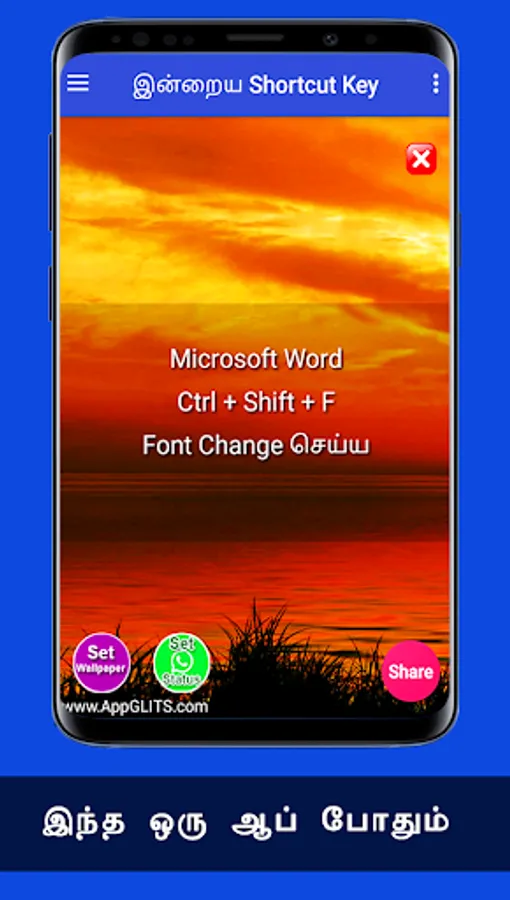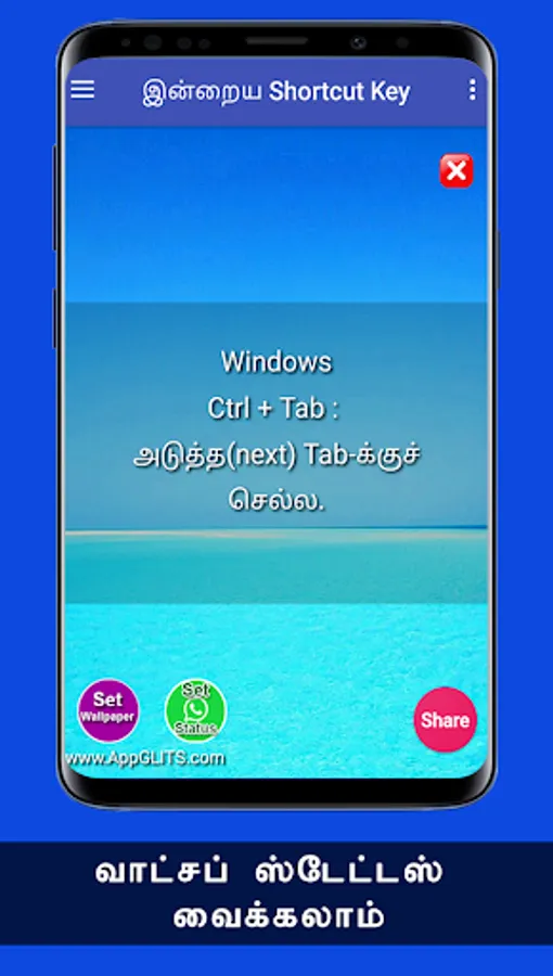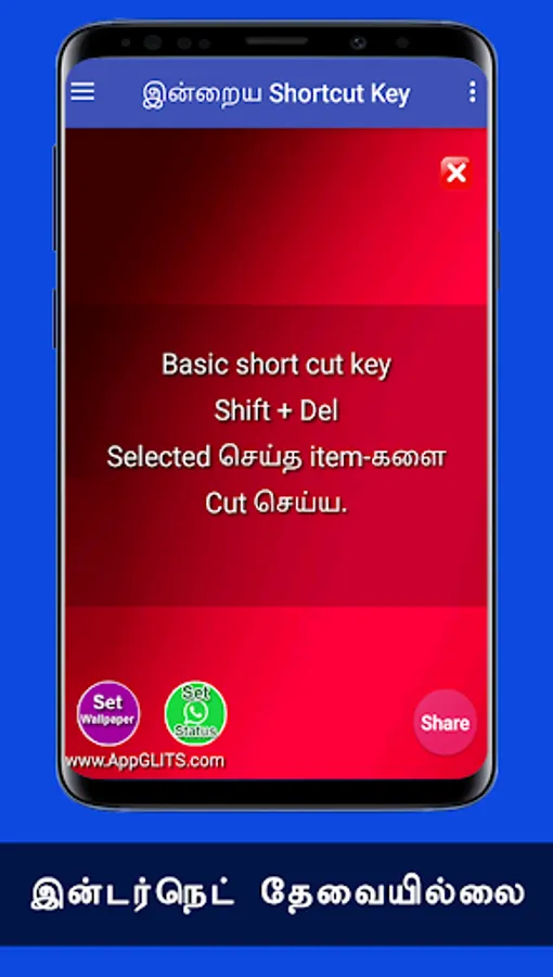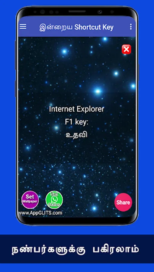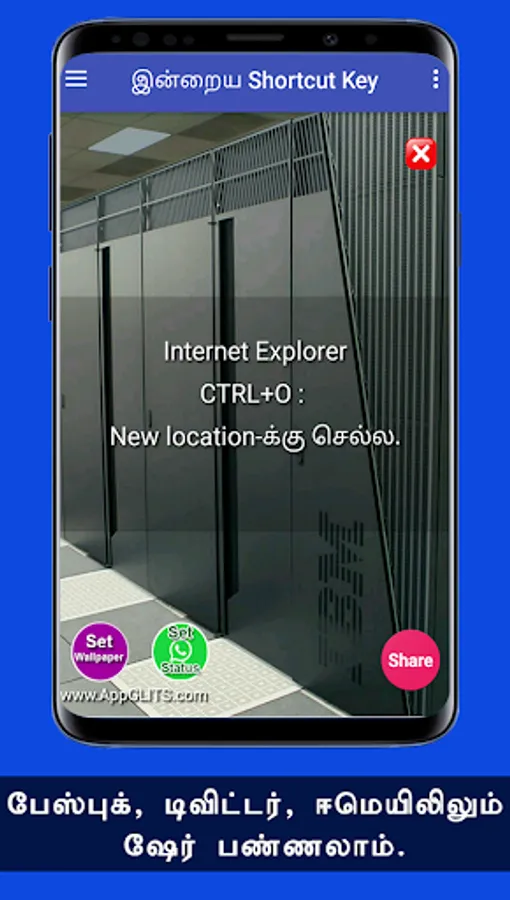 இதற்காகவே இந்த ஆன்ட்ராய்டு செயலியை உருவாக்கி உள்ளோம். இந்த செயலி வழியாக உங்களுக்கு தேவையான கம்ப்யூட்டர் ஷார்ட் கட் கீ (Shortcut Keys) தகவல்களை இலவசமாக பெறலாம். நண்பர்களே!! இந்த செயலியின் மூலம் உங்களுக்கு விருப்பமான நேரத்தில், ஷார்ட் கட் கீ தகவல்களை மொபைல் போனில் நோட்டிபிகேஷனாக பெறலாம். இன்னும் ஒரு நல்ல விஷயம் என்னவென்றால், வாட்சப், பேஸ்புக், டிவிட்டர், ஈமெயில் வழியாவும் உங்கள் நண்பர்களுக்கு ஷேர் பண்ணலாம்.