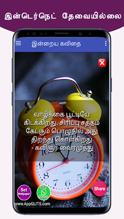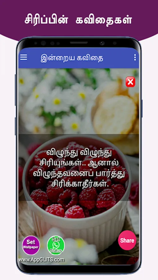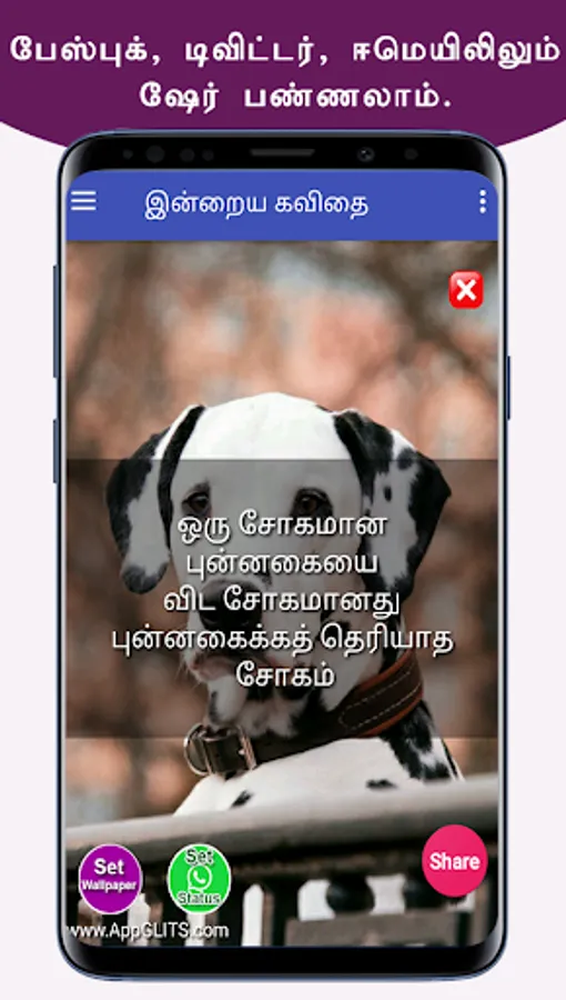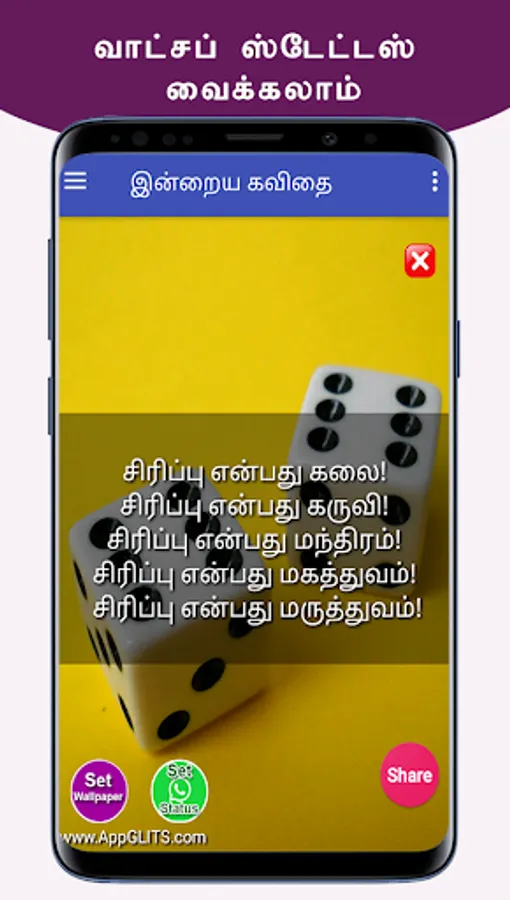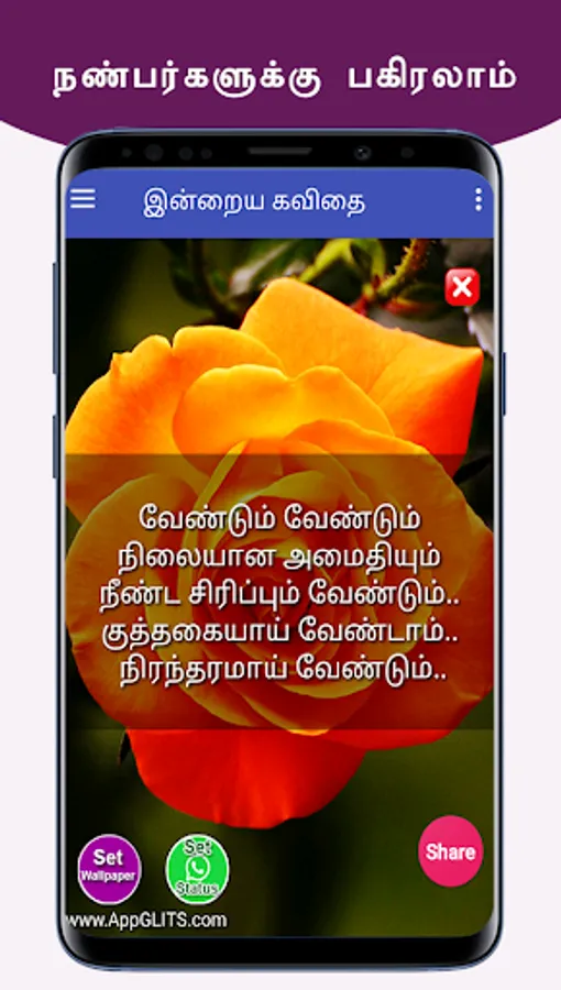 இந்த புன்னகை கவிதைகளை நீங்கள் பெற்று பயனடைவதோடு இல்லாமல் உங்கள் நலம் விரும்பிகள் எல்லாருக்கும் வாட்ஸப்பில் ஷேர் பண்ணுங்க. அதன் மூலம் அவர்களும் பயனடைவார்கள். இந்த செயலியின் மூலம் உங்களுக்கு விருப்பமான நேரத்தில், புன்னகை கவிதைகளை மொபைல் போனில் நோட்டிபிகேஷனாக பெறலாம். மேலும் வாட்சப், பேஸ்புக், டிவிட்டர், ஈமெயில் வழியாவும் உங்கள் நண்பர்களுக்கு ஷேர் பண்ணலாம். இந்த ஆப் ஐ உங்கள் நண்பர்களுக்கும் பகிருங்கள். நன்றி.