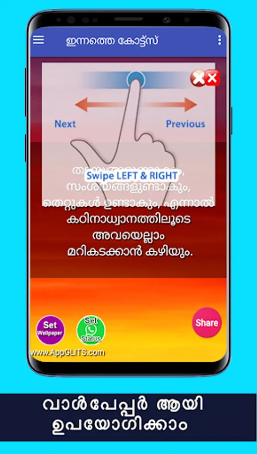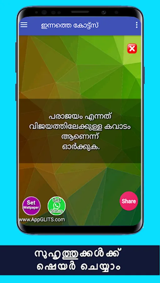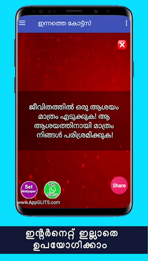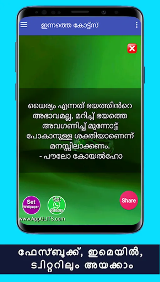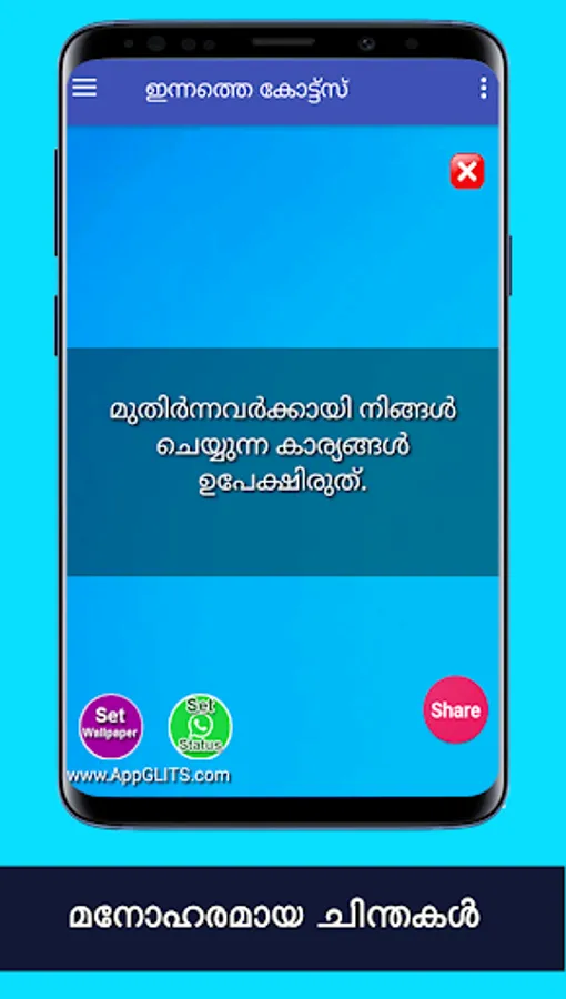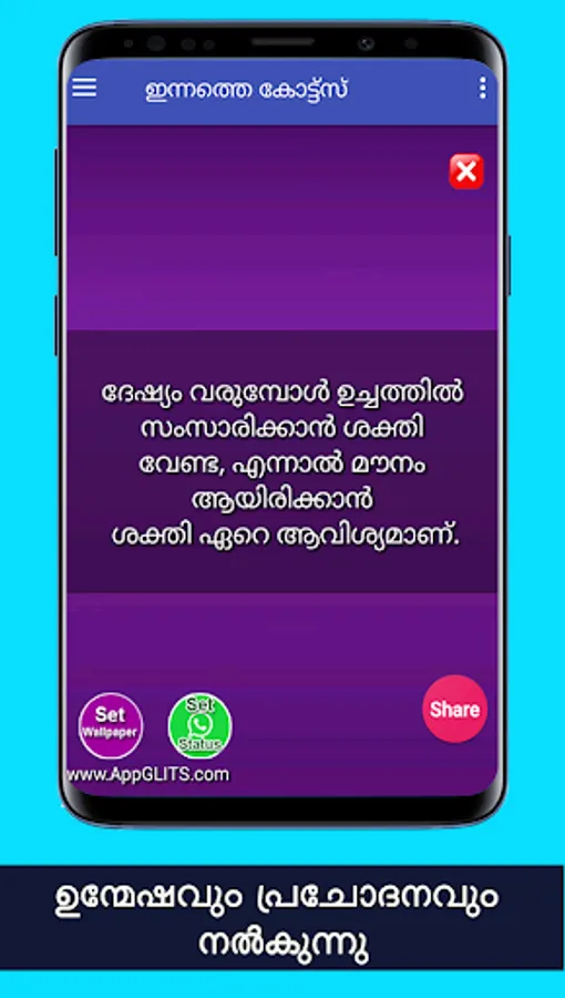 നമ്മുടെ ജീവിതത്തിൽ പല പ്രയാസം ഏറിയ നിമിഷങ്ങളെയും മറികടക്കാൻ നമുക്ക് മനഃശക്തി ഏറെ ആവിശ്യമാണ്. നമ്മുടെ മനസിന് ശക്തി പകരുന്ന ചില വരികൾ ആണ് ഈ ആൻഡ്രോയിഡ് ആപ്ലിക്കേഷനിൽ ഉൾപ്പെടുത്തിയിരിക്കുന്നത്. ഇത് നമ്മിൽ വളരെ ഉന്മേഷവും പ്രചോദനവും ഉളവാക്കുന്നവ കൂടിയാണ്. കൂടാതെ ഇത് നിങ്ങളുടെ കൂട്ടുകാർക്ക് ഷെയർ ചെയ്യാനും Whatsapp സ്റ്റാറ്റസ് ആയി കൂടെ വക്കാവുന്നതുമാണ്. ഈ ആൻഡ്രോയിഡ് ആപ്ലിക്കേഷൻറെ notifications നിങ്ങൾക്ക് ക്രമീകരിക്കാം. ഇതിലുള്ള കോട്ട്സ് Whatsapp, Facebook, twitter, email ഇതുപോലുള്ള Social Media-കളിലും ഷെയർ ചെയ്യാവുന്നതാണ്. ഈ ആപ്ലിക്കേഷൻ ഇന്റർനെറ്റ് ഇല്ലാതെയും ഉപയോഗിക്കാം. പ്ലേ സ്റ്റോറിൽ ഞങ്ങൾക്ക് 5 സ്റ്റാർ റേറ്റിംഗ് നൽകി സഹായിക്കുക. നന്ദി..