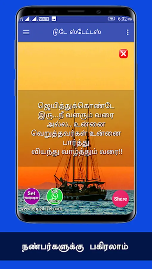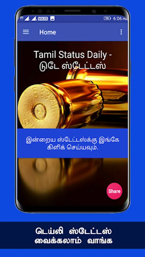Hai friends !! Have a nice day !! Its an very simple Tamil app. Here You can get status in our Tamil Language. You can share these tamil quotes and many more. Daily You can see the status tamil and get enjoy every moment. In this app we show status photos download. Here let you know about how to find status download in tamil etc. These best status tamil will touch your heart. You can share dp in tamil and web many more. Also Here You can get status love etc. Also you share many tamil status download to your favouite one. Here You can get best status tamil apps and many more things about our daily life. So stay tuned our app and get the profile pic in tamil via our simple tamil android application. Also some features of our app is tamil status free download and you will be geting positive approach. You can share new tamil status about life and sad quotes in tamil more. Here in this app let you know about how to get best tamil status about life and get inspirations. Here You can get status kavithai in tamil. Don't miss this friends !! in this app simple attitude quotes share to all your friends. Here You can get love quotes tamil etc. You can set love status hd walpapers Quotes.
