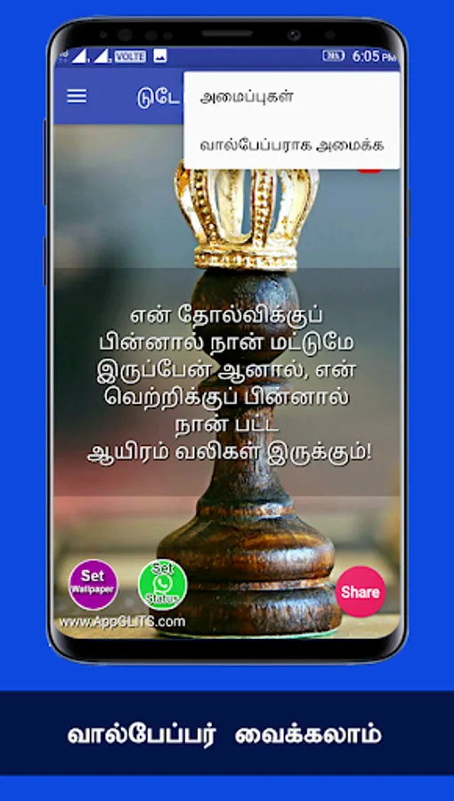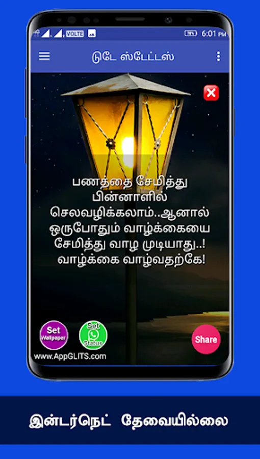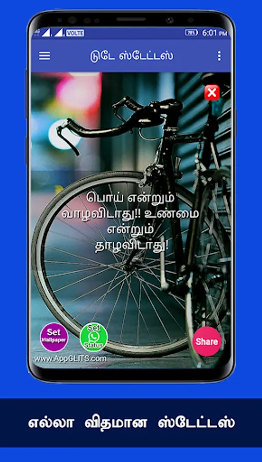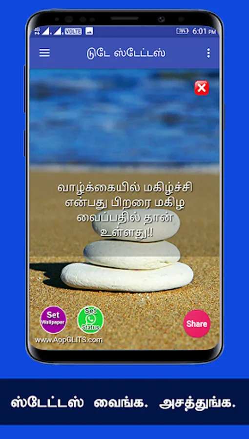 எல்லா விதத்திலும் ஸ்டேட்டஸ் வைப்பதற்கு ஏதுவாக பல்வேறு தத்துவங்களாக இணையதளங்களில் ஷேர் பண்ண இந்த ஆன்ட்ராய்டு செயலியை உருவாக்கி உள்ளோம். இந்த செயலி வழியாக உங்கள் ஸ்டேட்டஸ்க்கு தேவையான பல விஷயங்களை இலவசமாக பெறலாம். நண்பர்களே!! இந்த செயலியின் மூலம் உங்களுக்கு விருப்பமான நேரத்தில், ஸ்டேட்டஸ்களை மொபைல் போனில் நோட்டிபிகேஷனாக பெறலாம். இன்னும் ஒரு நல்ல விஷயம் என்னவென்றால், வாட்சப், பேஸ்புக், டிவிட்டர், ஈமெயில் வழியாவும் உங்கள் நண்பர்களுக்கு ஷேர் பண்ணலாம்.