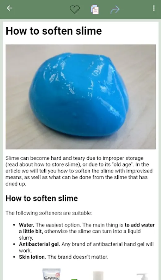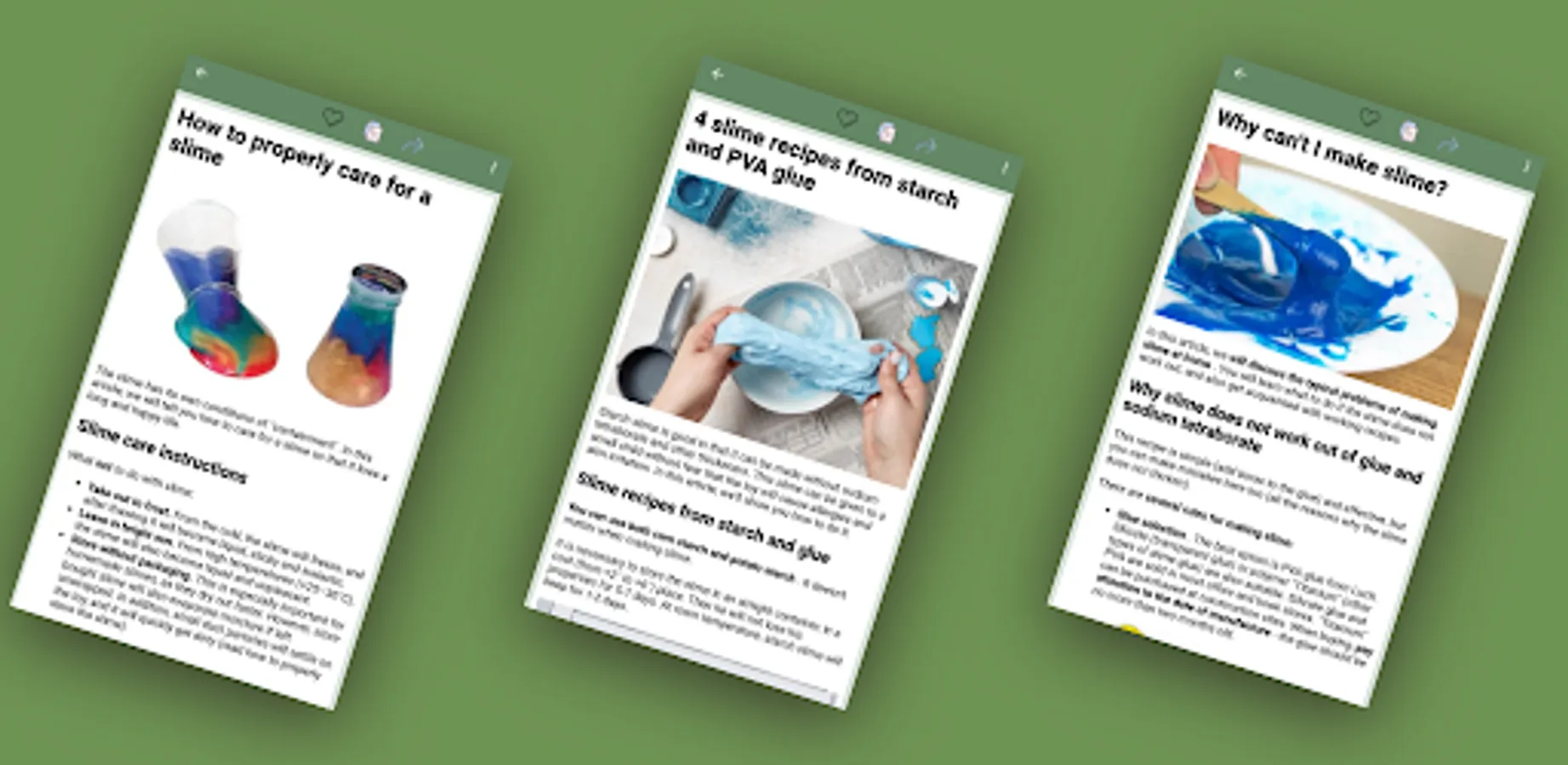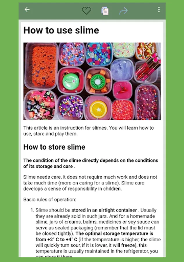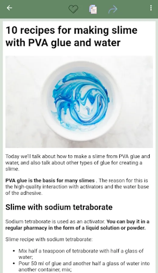 Our app contains many glue and tetraborate free slime recipes so you can create safe and unique slime for yourself and your friends. We also offer classic slime recipes, such as tetraborate slime, which may be of interest to experienced users.