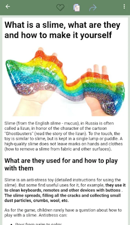 In our application you will find instructions on how to make slime from various ingredients, including water, spikes and eyes. We also offer easy slime recipes that don't require complicated tools or special materials.