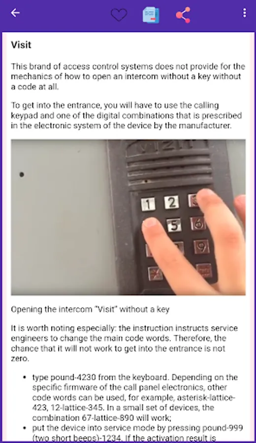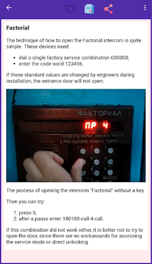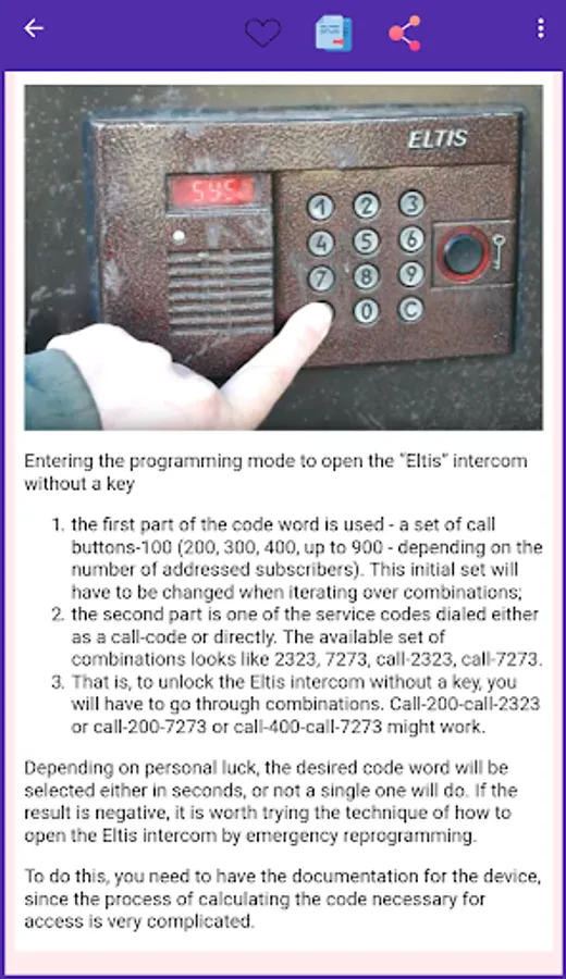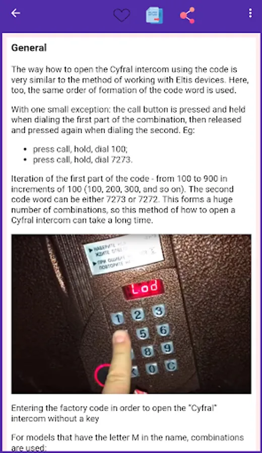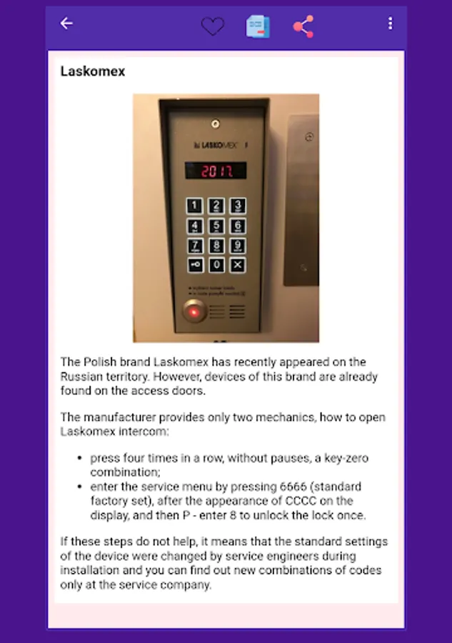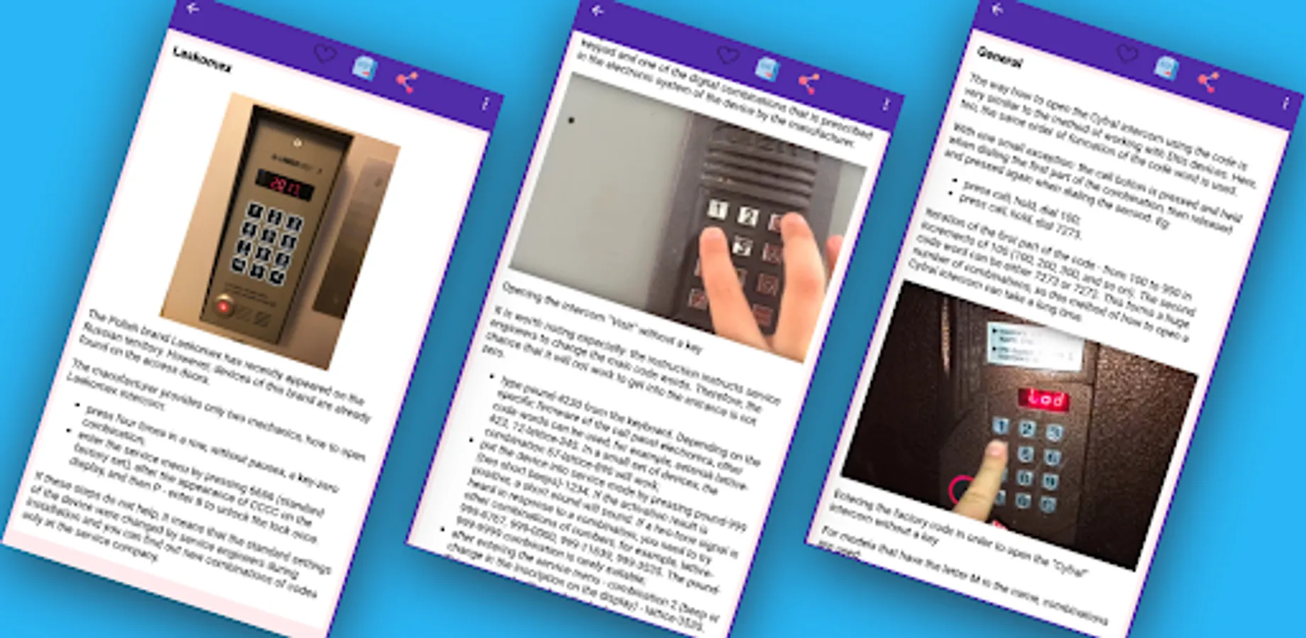 With the "Intercom Codes" application, users can easily find the required code to open the intercom. The application provides all the codes for intercoms that can be used to access the building.