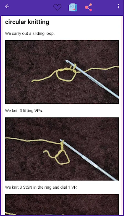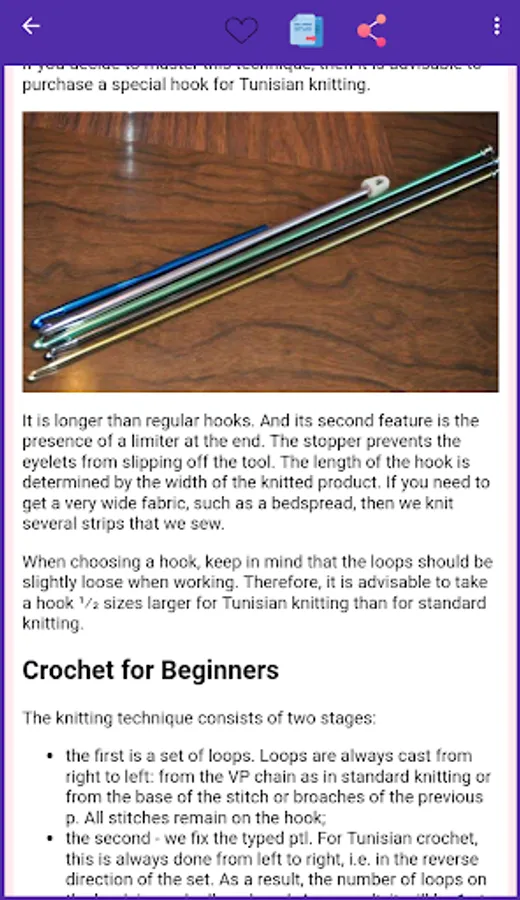 The application offers step-by-step knitting lessons for beginners, including knitting booties, hats, scarves, slippers, cardigans, children's things and toys, as well as lessons on knitting flies and washcloths. The application also contains patterns and step-by-step instructions for crochet, including amigurumi and flowers, as well as lessons on sirloin and Tunisian knitting.