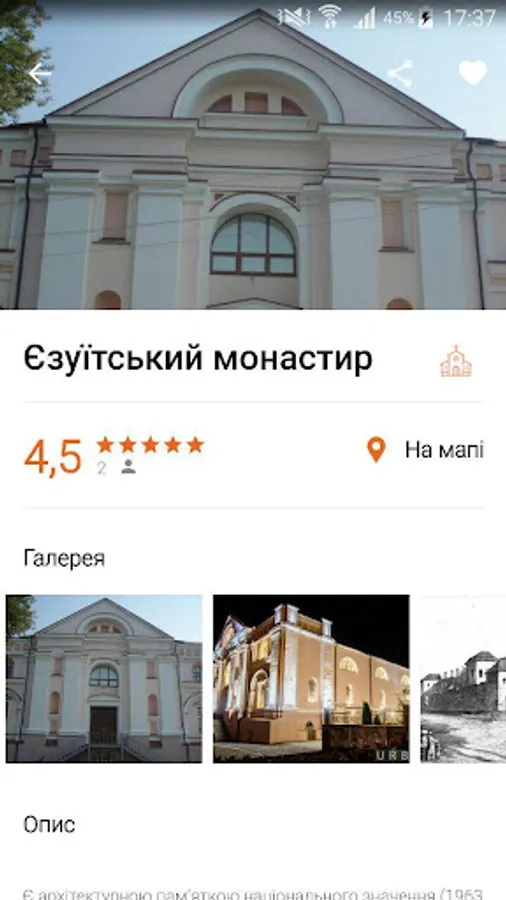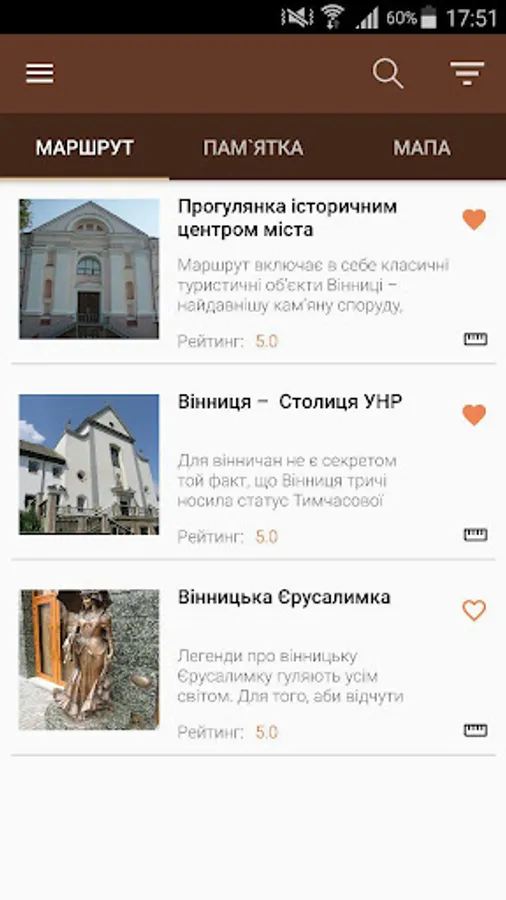 The application provides an opportunity to navigate through the tourist attractions of the city using a list of monuments and tourist routes laid out on the city map. Each route has consistently connected passing points, approximate time of excursion, and information support of each attraction. The app contains a scoring option that affects the overall rating of the attractions. In addition, the user will be able to create their own route and offer it to moderators.
